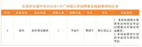 为推进学校教育事业发展,我校将于2026年1月随东莞市教育局赴广州设点面向全国优秀毕业生公开招聘事业编制教师1名,被录用者纳入公办学校事业单位人员编制,工资福利待遇由市财政统发。
