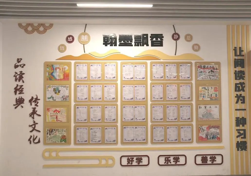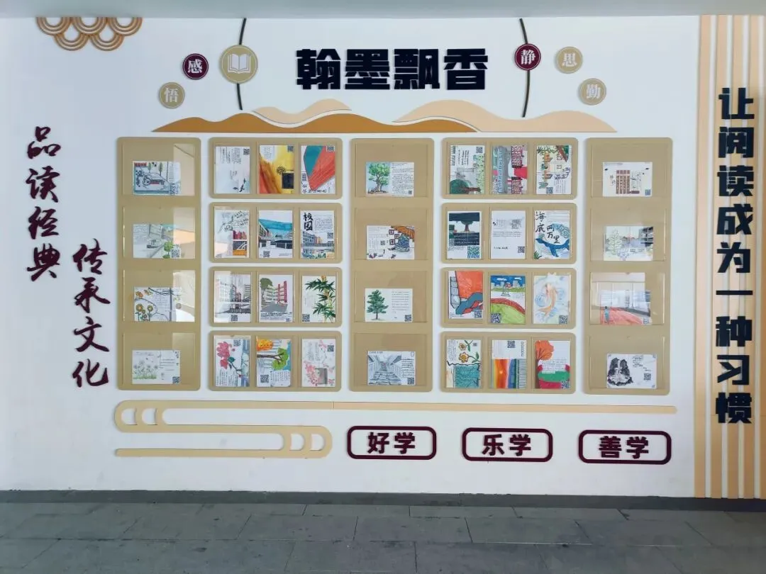 学校打造“诗词长廊”“班级诗园”“四季诗景”等文化景观,让每一面墙壁、每一处角落都成为“会说话”的诗意空间,师生行走其间,抬头见诗、低头品韵,沉浸于浓郁的诗教氛围中。
