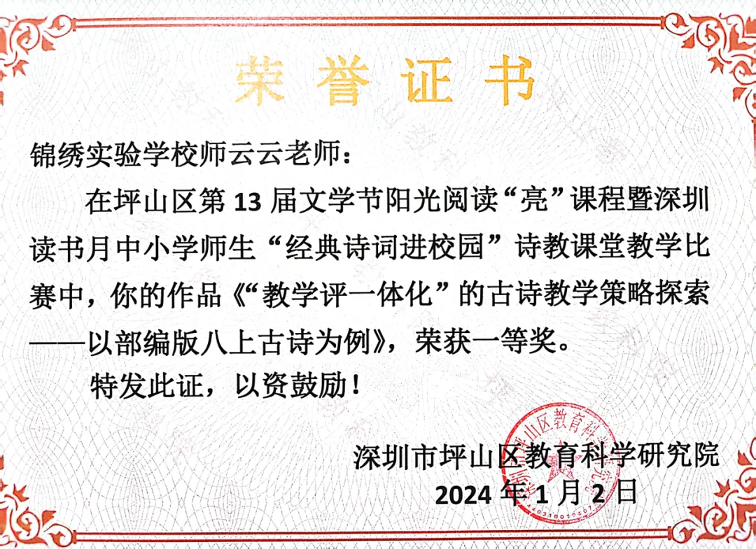 语文科组全员参与市、区级诗教专题培训,多位教师在各级教学竞赛、“诗教中国”大赛、诗词优质课评比中屡获佳绩。相关校级诗教课题顺利结题,形成系统化实践策略与典型教学案例,为诗教实践提供有力支撑。