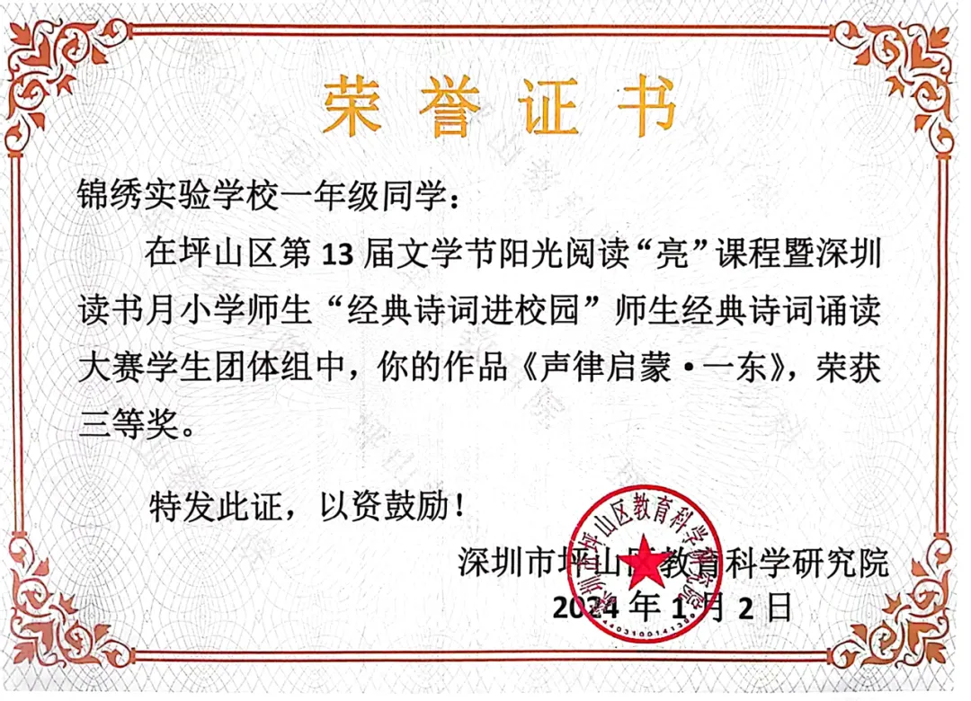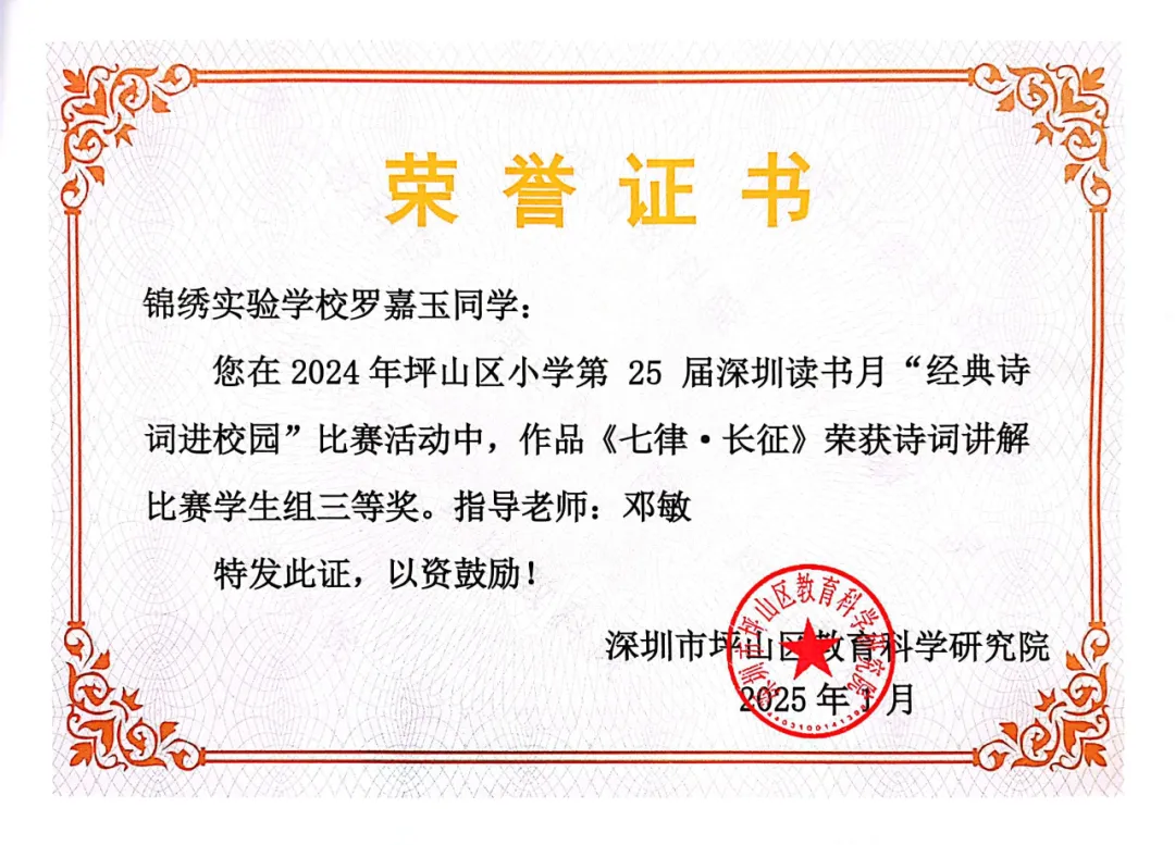继入选2025年广东省青少年学生读书行动“书香校园”后,坪山区锦绣实验学校再传佳音——成功获评深圳市“中华诗教综合育人”项目先行学校。此项荣誉,是对学校持续深耕诗教、传承中华文脉的充分肯定,更是师生同行、家校共育的温暖见证。建校三年多来,学校始终将中华优秀传统文化教育作为立德树人的重要根基,深入挖掘经典诗词中的德育与美育价值,让诗意流淌校园,让经典滋养心灵。