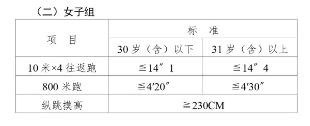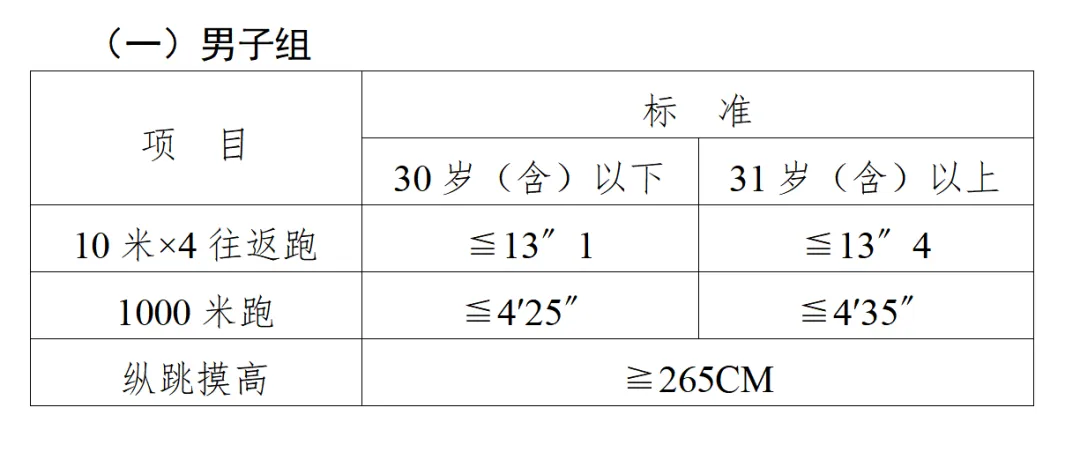 体能测评包括三个项目,分别为纵跳摸高、10米×4往返跑、1000米跑,每个项目测试次数不超过2次。体能测评采用达标制,任意一项不达标的,即为体能测评不合格,不进入下一环节。体能测评不设缓测、补测,达标标准详见下表。
