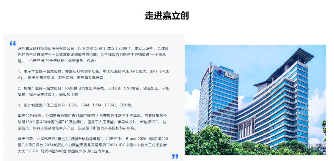 据嘉立创官网介绍,该公司成立于2006年,是立足深圳、全球领先的电子及机械产业一站式基础设施服务提供商,为全球数百万电子工程师提供“一个概念进,一个产品出”的全链路硬件创新服务。截至目前,公司已连续5年进入“胡润全球独角兽榜”,并获得“Top Brand 2025中国品牌500强”“人民日报社·2024新质生产力赋能高质量发展案例”“2024 IDC中国未来数字工业领航者大奖”“2023年胡润中国500强”等国内外多项行业内荣誉。