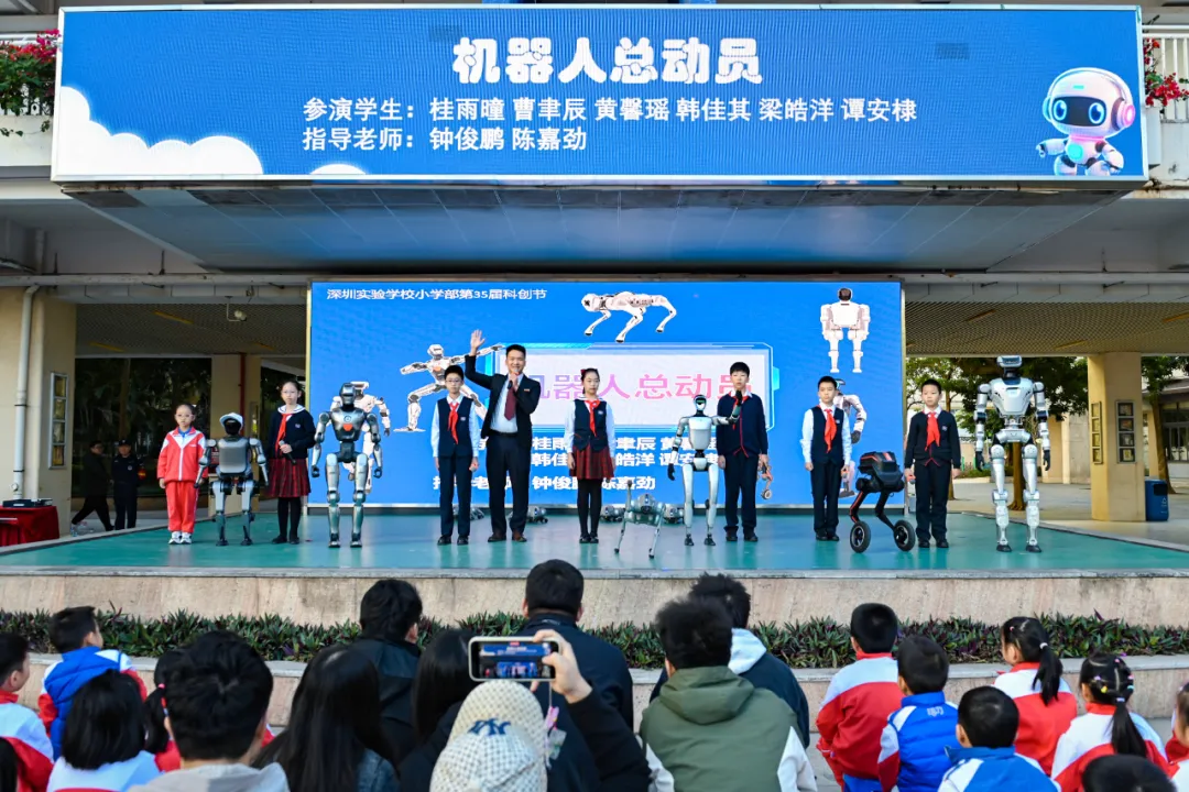 深圳实验学校小学部在今年科创节上,邀请逐际动力等机器人领域先锋企业以及深圳市青少年活动中心等单位联动,将数款最新人形机器人全校展示,引发了学生的阵阵惊叹。