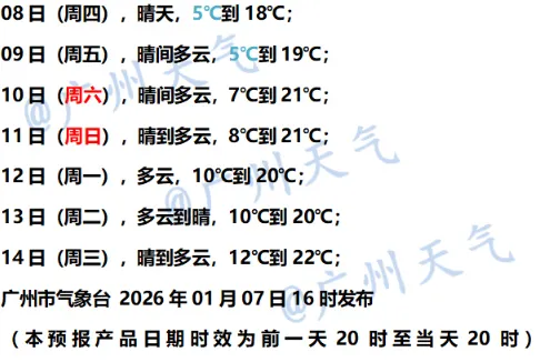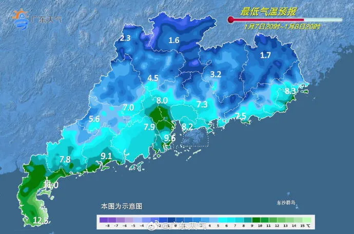 8日,全省大部晴到多云,昼夜温差大,早晚寒冷。最低气温:粤北、珠三角北部市县1~5℃,其中高海拔山区零下4~0℃,有霜冻和冰冻,湛江10~14℃,其余市县6~9℃。