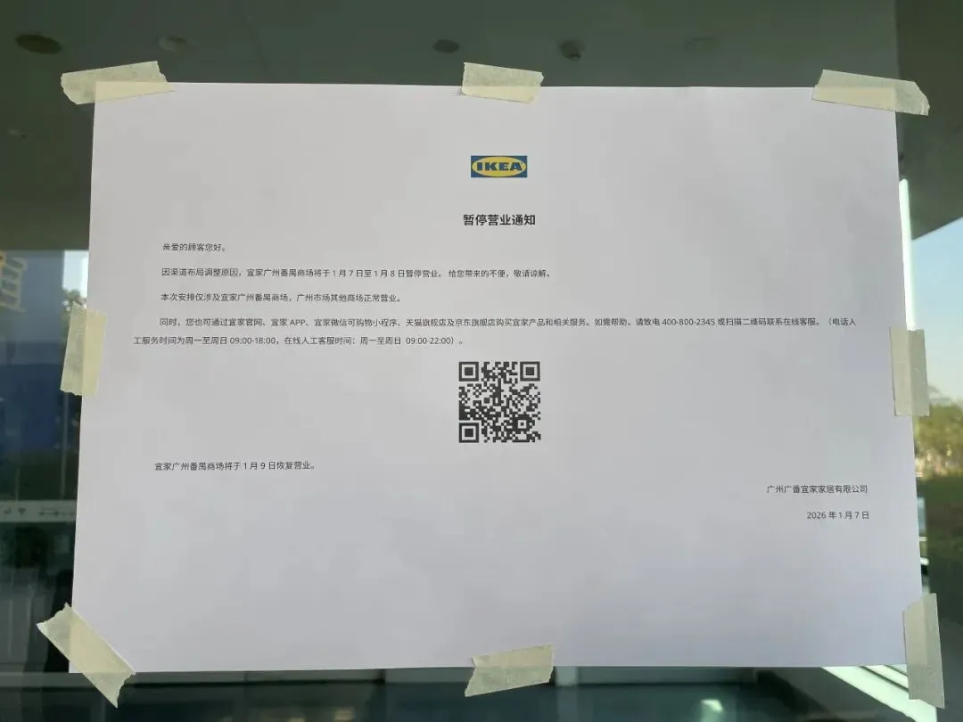 今天,广州番禺宜家商场门口已经贴出了暂停营业通知。通知显示:因渠道布局调整原因,宜家广州番禺商场将于1月7日至1月8日暂停营业。