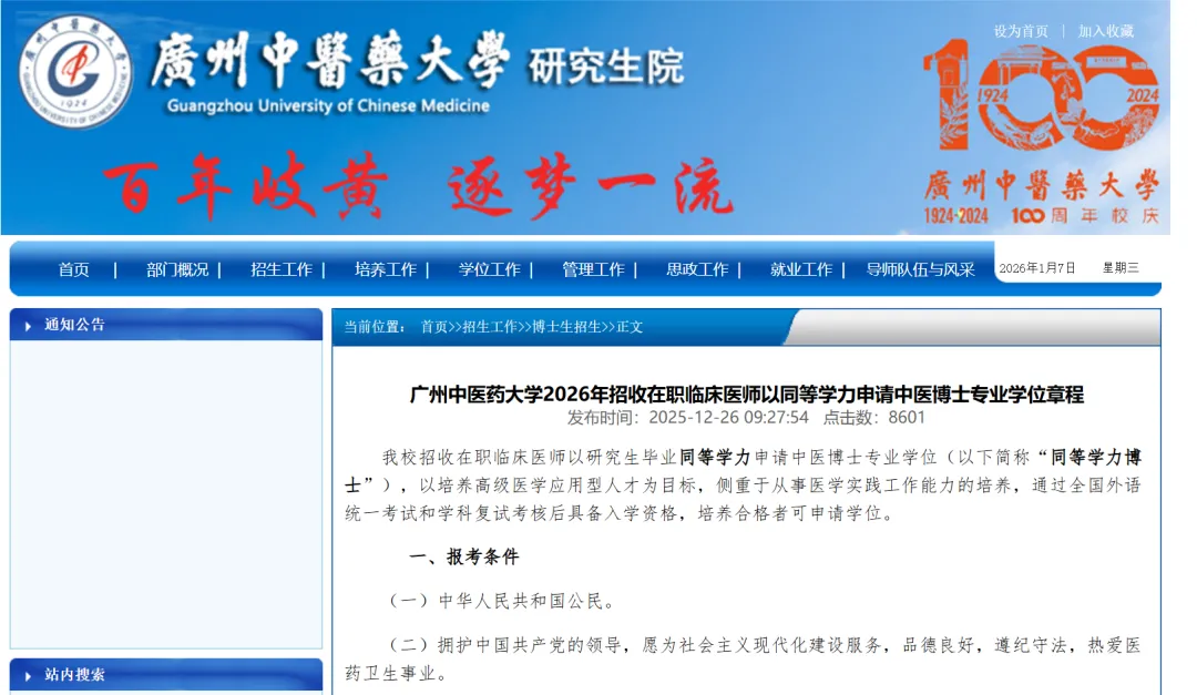 广州中医药大学2026年招收在职临床医师以同等学力申请中医博士专业学位章程