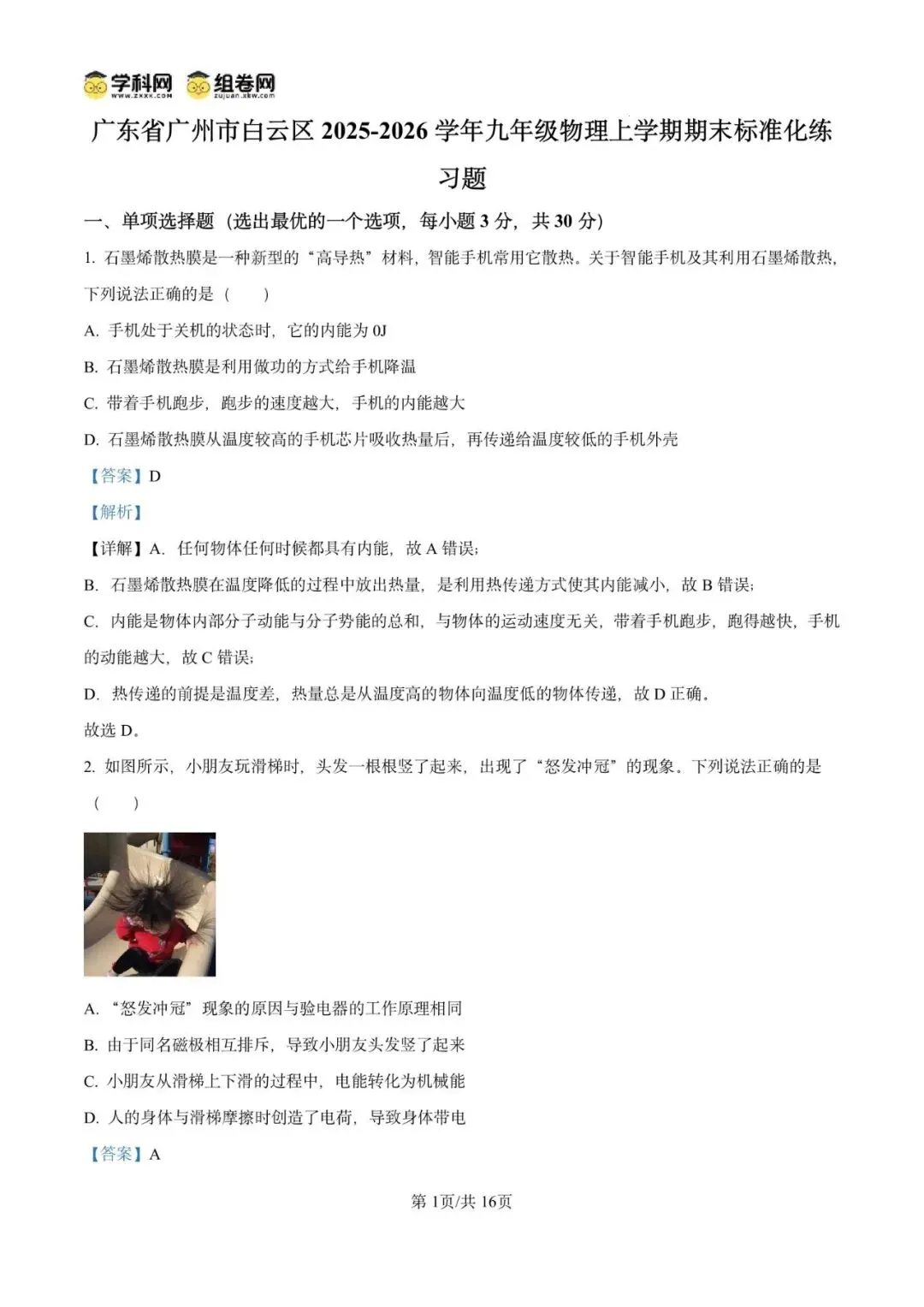 精品解析:广东省广州市白云区2025-2026学年九年级物理上学期期末标准化练习题(解析版
