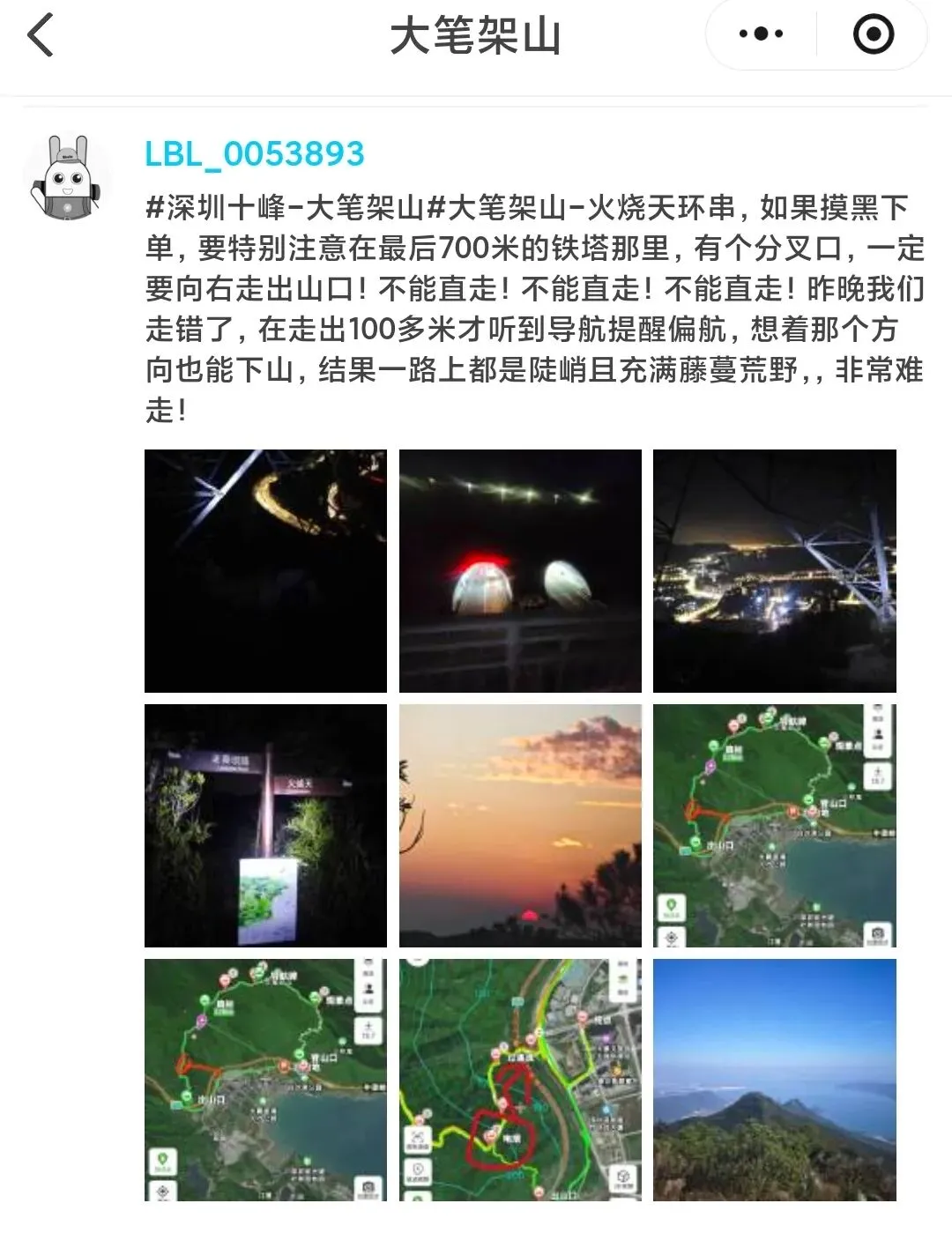 十峰最后一座山,走【大笔架山-火烧天】环穿路线,路程12公里,耗时9小时45分钟,其中摸黑下山走了一个半小时,最后半小时在电塔走错路口,上演黑夜荒野求生记(晚上一定要紧盯导航,千万别走错!!!)