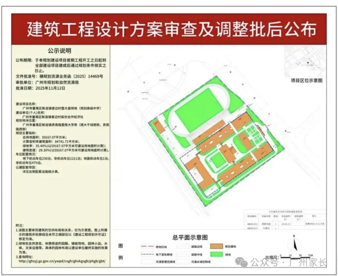 广州市规划和自然资源局发布了广州市番禺区新造镇曾边村暨大留用地(规划高级中学)的建设工程设计方案审查及调整批后公布图。