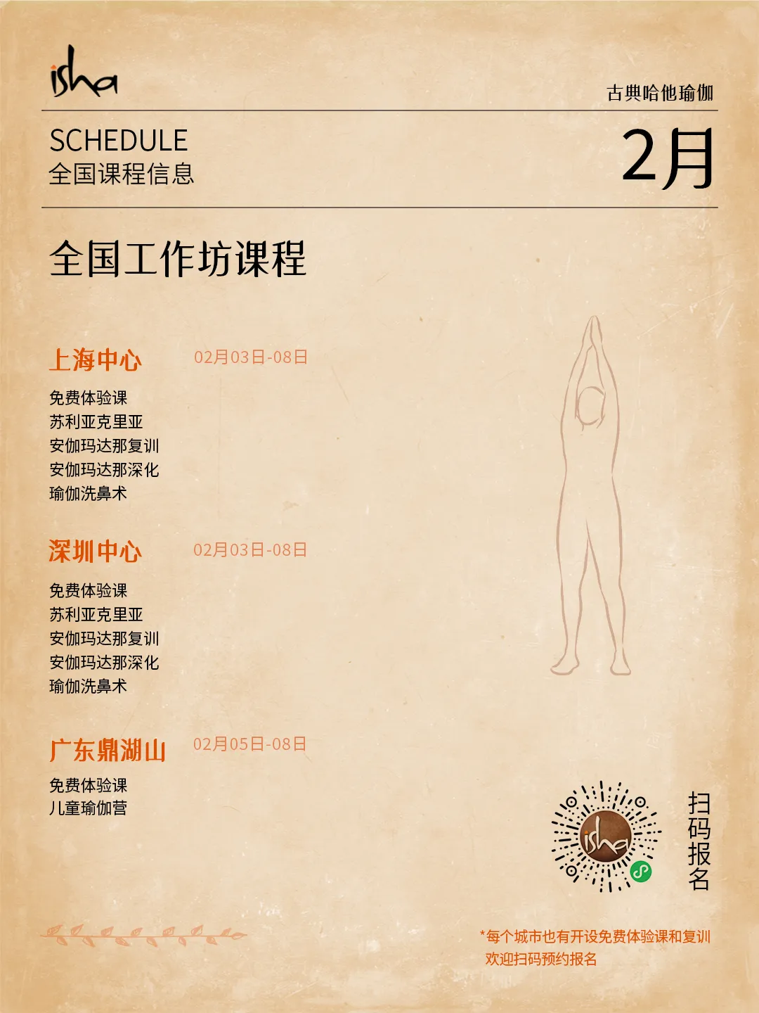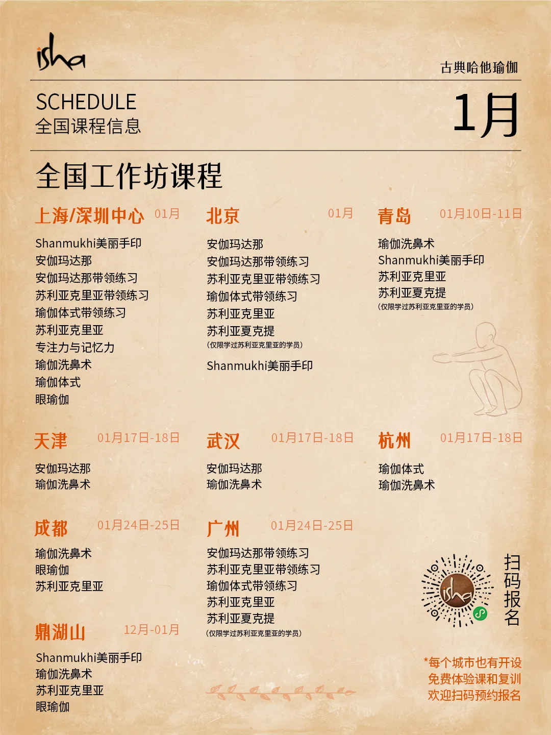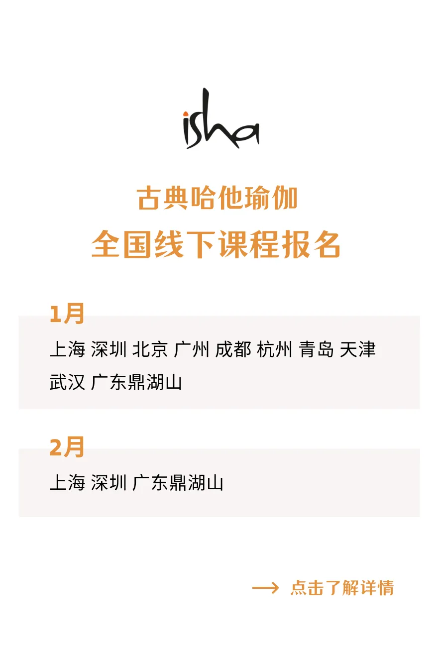 Isha瑜伽由萨古鲁创办,致力回归古典瑜伽最纯粹的形式,所有课程由萨古鲁亲自设计,在中国各大城市定期有Isha瑜伽系列课程,可点击下方图片查看课程安排。