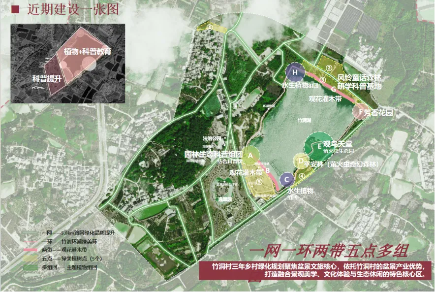 竹洞村是岭南盆景之乡,家家户户种盆景的传统塑造了村民们突出的审美意识和经营意识。因此,在绿美乡村建设初期,竹洞村党总支就提出了“以绿为基、筑绿为美、点绿成金”的发展思路。在竹洞村党群服务中心,一张由广州市园科院,花都区农业农村、林业部门以及区属国企等多个部门共同编制的《竹洞村乡村绿化规划图》格外醒目。竹洞村的乡村绿化特别之处在于实现了现代设计与乡土记忆、风貌提升和产业发展的有机融合:一是以环湖发展轴为脉络,避让百年古树、传统建筑;二是通过系统摸排,精准锁定17处绿化空间,定制“乡土植物套餐”,创新绘制“一树一坐标”精细化施工图;三是同步融入产业规划,为乡村长远发展留足空间。要把“愿景”变“实景”,离不开广大党员群众的实干苦干。2024年以来,竹洞村党总支持续发挥“党建+”引领效应,建立党员联系乡贤机制,利用春节、清明等节假日开展乡贤联情走访活动,动员乡贤认捐认种认养。积极联动24家党政机关党组织,先后开展“我为竹洞种棵树”“乡村绿化先锋行”等活动,发动500名在职党员认领“竹洞添绿”微心愿,劝导村民主动腾挪绿化空间,党群合力植树3000棵。2025年3月,全省乡村绿化主题植树活动省级会场选定竹洞村,省、市、区、镇、村五级联动,共同在竹洞村种下了一片绿美之林、希望之林。
