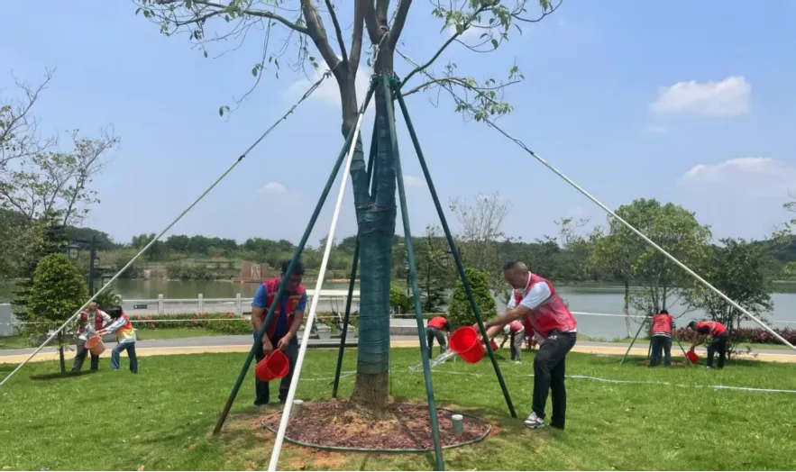 乡村绿化,树要种得下,还要栽得活、长得好。竹洞村党总支牢固树立“三分种、七分管”的理念,强化组织带领、党员带动、群众参与,不断激发内生动力、做实长效管护。“以前树死了只会补种,现在有‘体检医生’了!”竹洞村依托红联共建机制,充分发挥广州市园科院资源优势,组织专业团队多次深入竹洞,开展科普下乡、苗木“体检”、除虫除害等活动,手把手为干部群众传授“三埋两踩一提苗”技术,并向竹洞村捐赠花卉苗木,打通绿化技术下沉基层“最后一公里”。