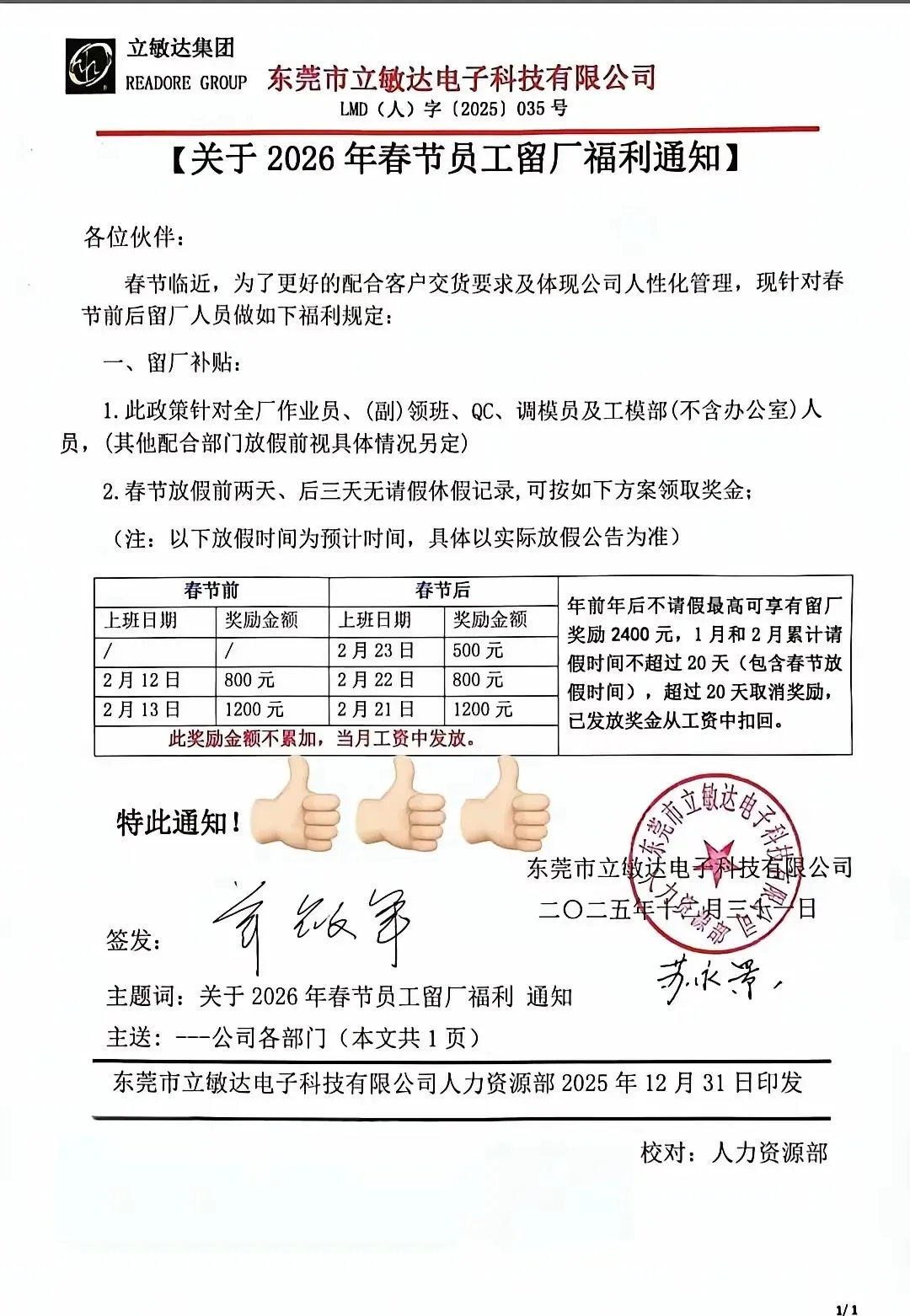 东莞又一良心企业出炉了,2026年春节留守奖,最低500元,最高1200元每天!够不够刺激,又羡慕嫉妒恨的呢!好老板都是别人的,也别怪员工不卖命干活,钱到位了啥都好说!千万别又想马儿跑,又想马儿不吃草!搞不定的事情砸钱试一下保证钱到病除!学学吧!