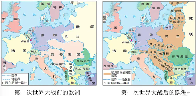 (1)比较材料一两幅地图,找出第一次世界大战前、后欧洲版图的2处变化(4分),并分析出现这2处变化的原因(4分)。