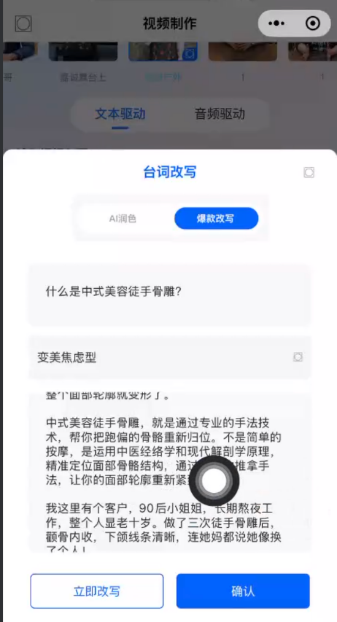 3.爆款文案AI生成只需输入关键词,如“徒手骨雕”,AI即可生成带“黄金三秒开头”、“痛点挖掘”、“专业解答”、“下单钩子”的完整口播文案。小白也能出专业脚本