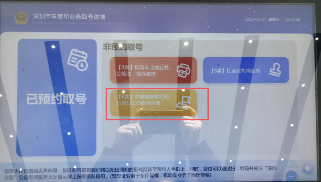 调取案件当事人的车辆信息属于现场办理的业务,采取非预约取号的方式,办理业务在二楼的业务大厅,进入二楼业务大厅后在门口两侧均有取号机,取号时选择非预约取号K类,车辆信息单打印,此类业务有纸质号码票,号段为K开始。