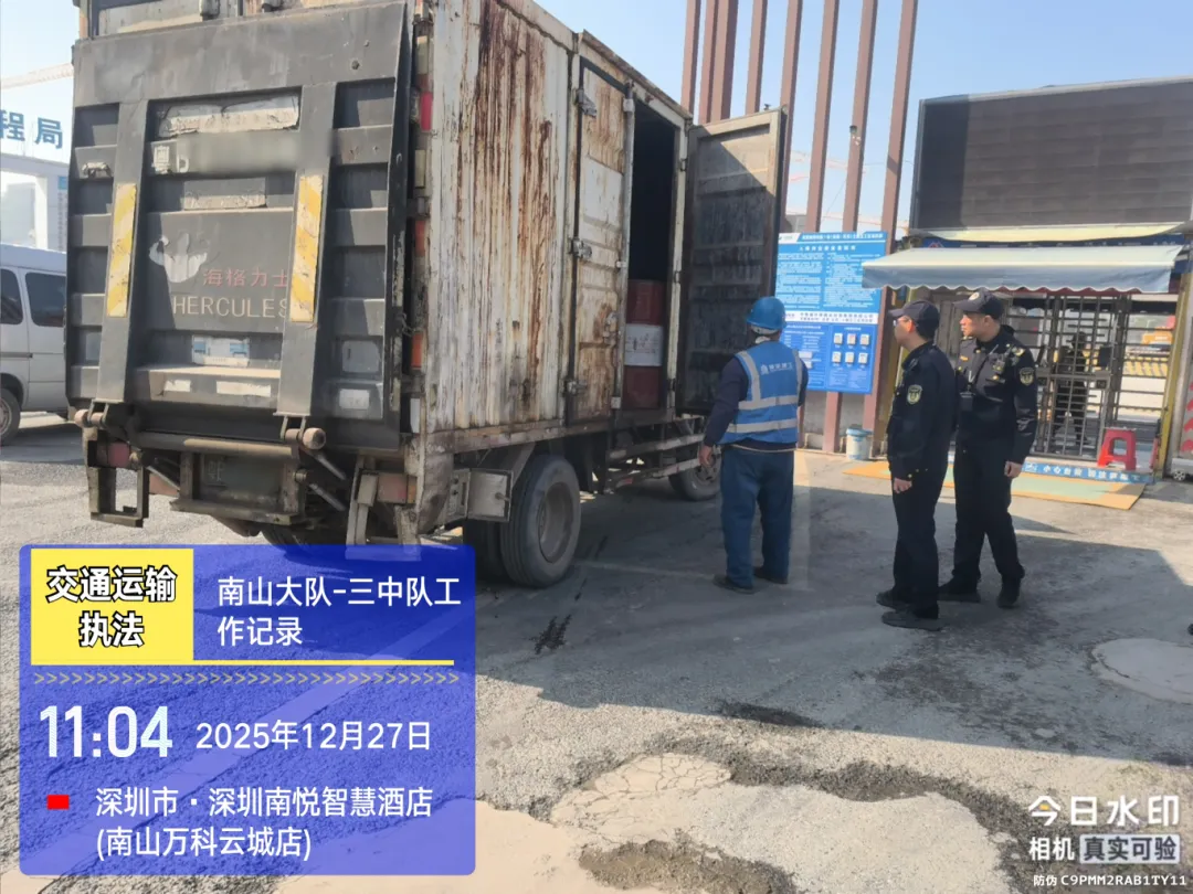 2025年12月27日,深圳执法支队南山大队在南山区龙珠大道龙珠石鼓路口公交站台附近开展巡查执法,现场成功查处一起非法运输危险货物(柴油)案件。