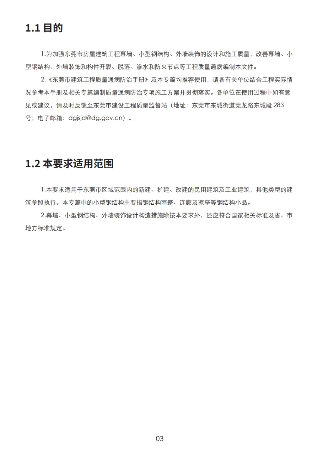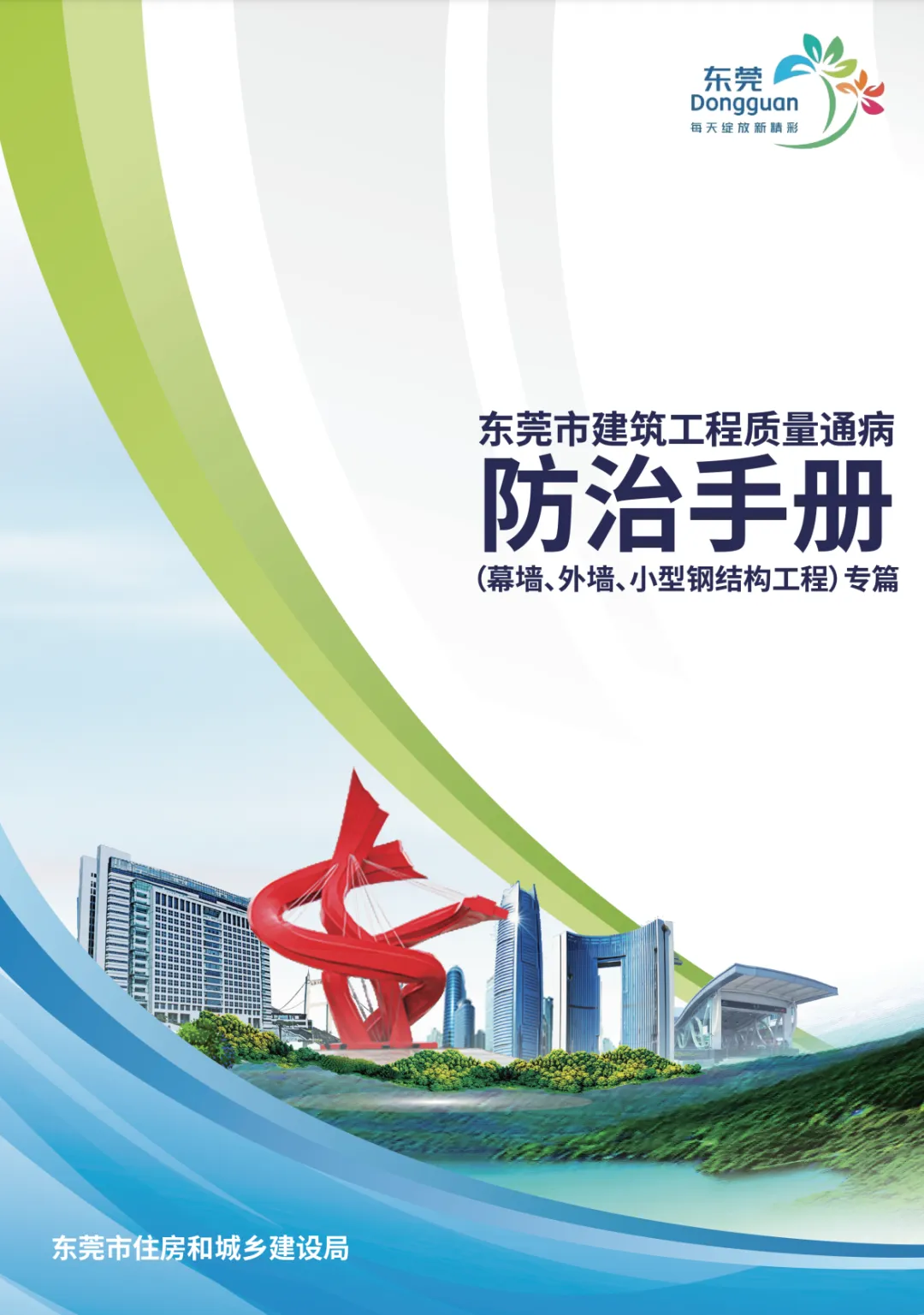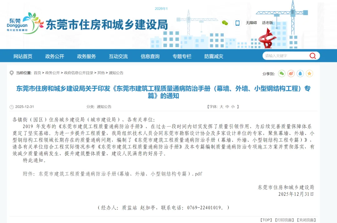 2019 年发布的《东莞市建筑工程质量通病防治手册》,在过去一段时间内切实发挥了质量引领作用,为后续完善质量保障体系奠定了坚实基础。为进一步提升工程质量,我局组织技术人员会同东莞市勘察设计协会及多家设计单位的专家,聚焦幕墙、外墙、小型钢结构工程领域长期存在的质量通病问题,编制了《东莞市建筑工程质量通病防治手册(幕墙、外墙、小型钢结构工程专篇)》,请各有关单位结合工程实际情况参考《东莞市建筑工程质量通病防治手册》及本专篇编制质量通病防治专项施工方案并贯彻落实,有效减少质量通病发生,提升建筑整体质量,建设人民满意的好房子。