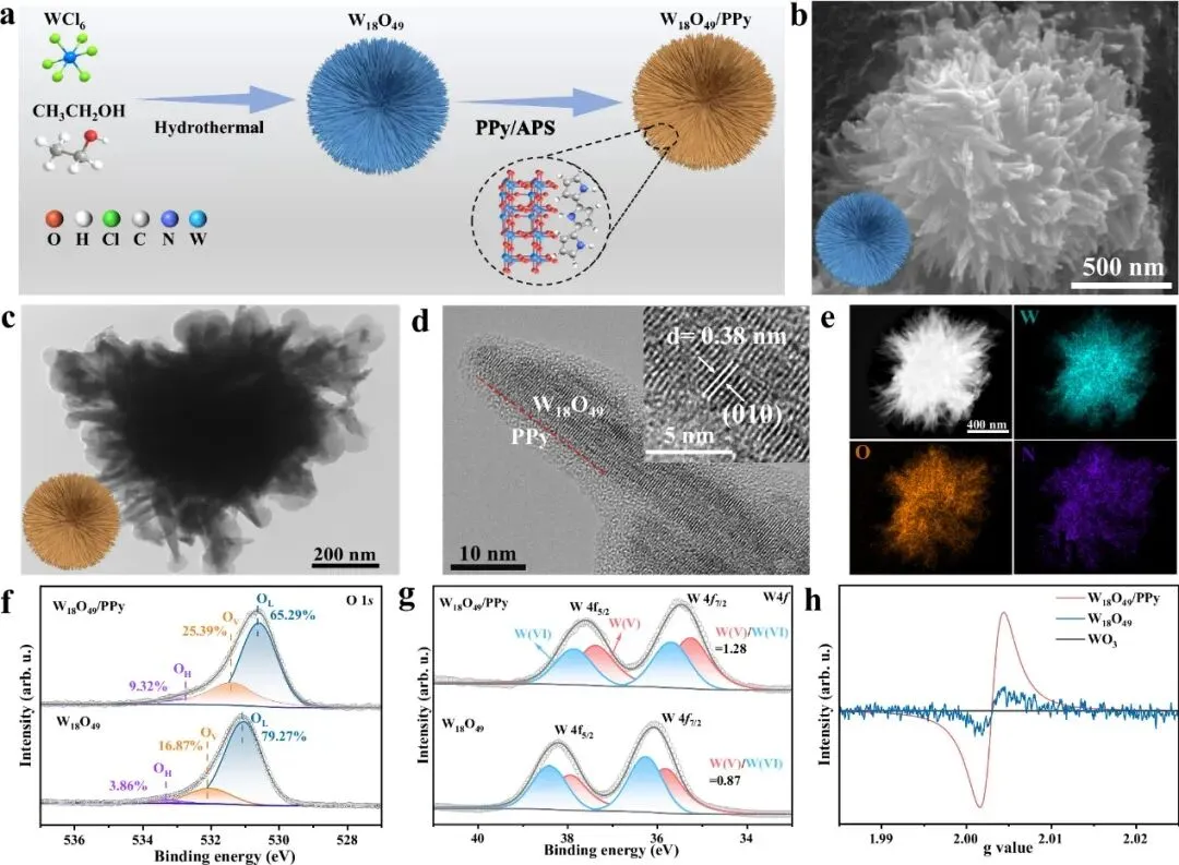 图1 海胆状W₁₈O₄₉/PPy纳米花复合材料的合成过程与结构表征