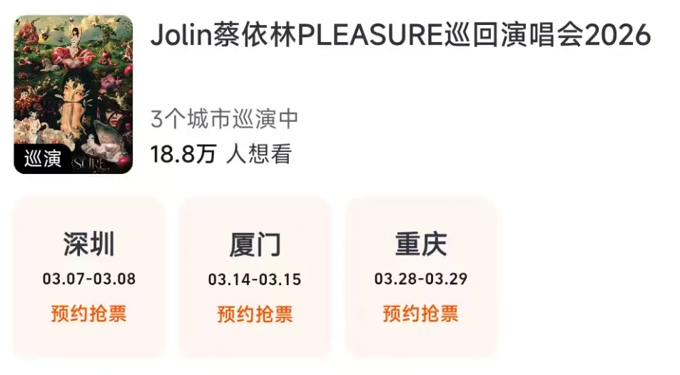 3月,让我们在深圳的晚风、厦门的海韵、重庆的热辣里,和Jolin一起解锁这场感官盛宴,把“耳机循环”变成“全场大合唱”!