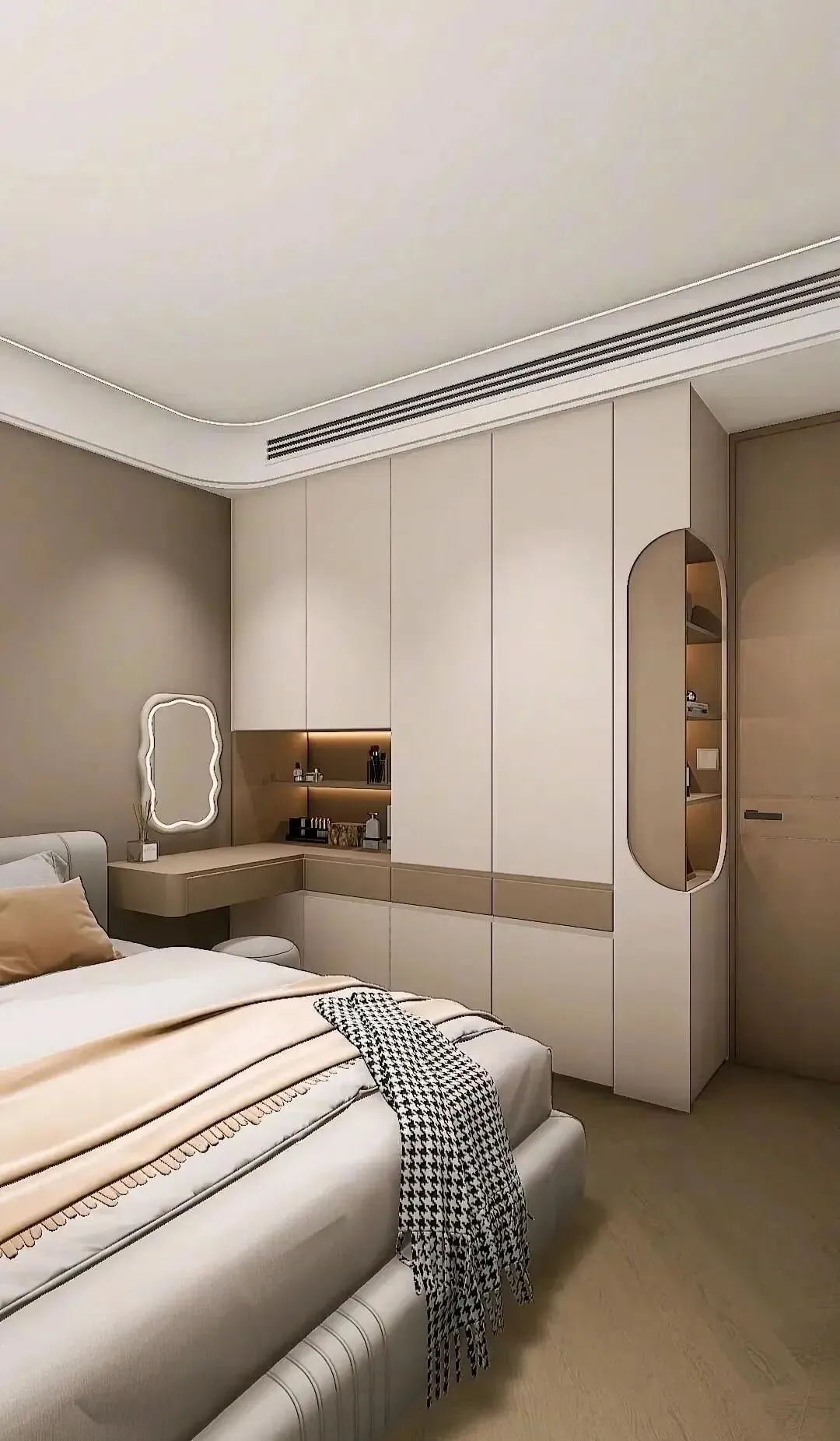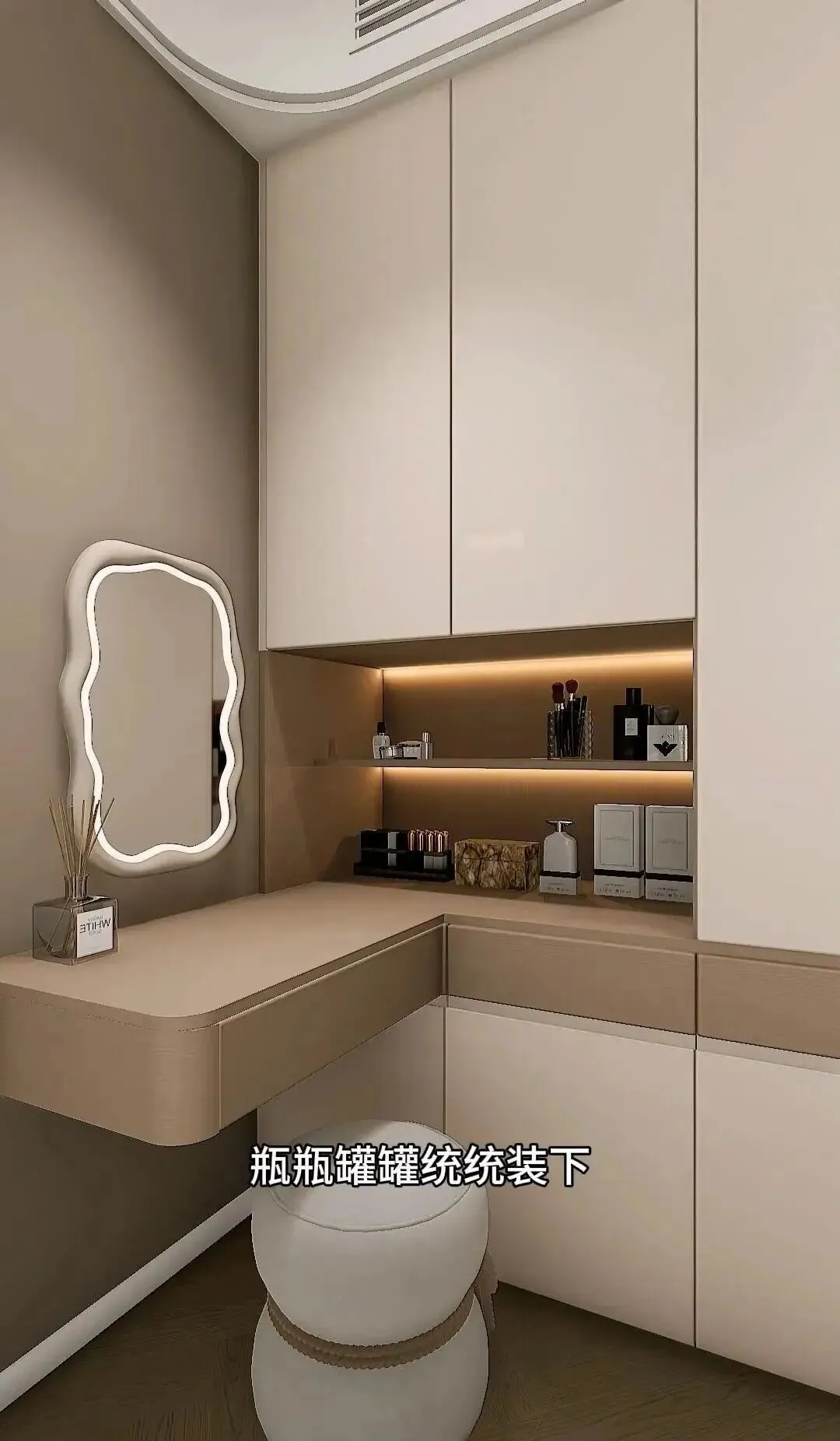 其实装个悬空梳妆台,别说老婆高兴,全家都耳根清净。东西收好,早上也不抢镜子了。@朋友阿文说得好:“我老婆坐那里化妆,连吵架都少一半。”- 梳妆台悬空+镜子+柔光灯,化妆顺心情绪稳