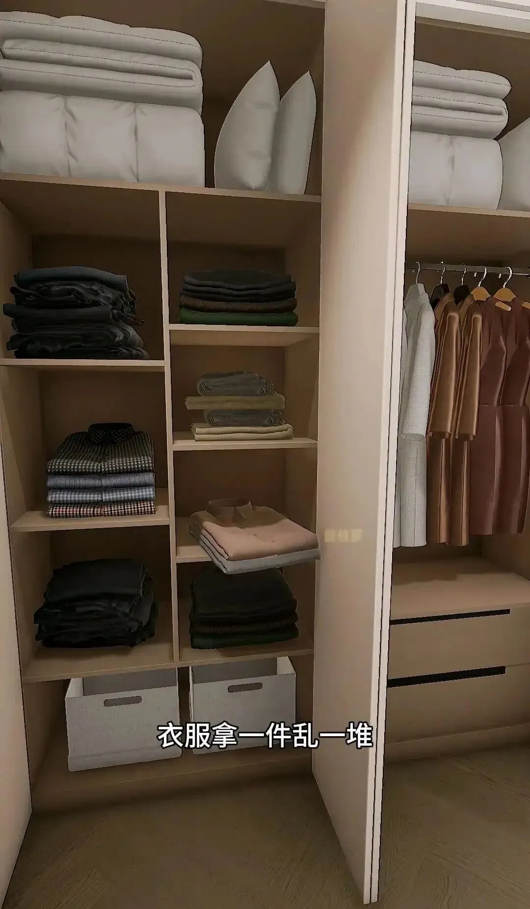 设计师总说“简约高级”,把抽屉全塞进柜子里。可住进去才明白,每次开抽屉像闯三道关卡。先开柜门,再拉抽屉,关键那柜门还卡着床边,一不留神膝盖就磕青了。我嫂子当初装完柜子不到一周,抱着衣服在房间原地爆炸:“怎么能这么蠢!!!”- 抽屉直接外露,拿内裤袜子一把梭