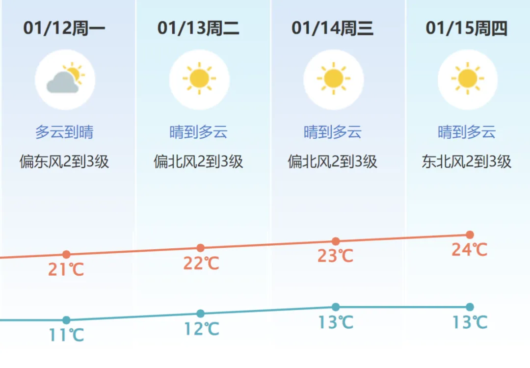 @东莞天气 预计我市8日受冷空气补充影响,晴朗干燥,最低气温降至7度左右;9—11日晴朗干燥,气温小幅回升;12日受东南气流影响,云量有所增多;展望13—15日以晴到多云为主。