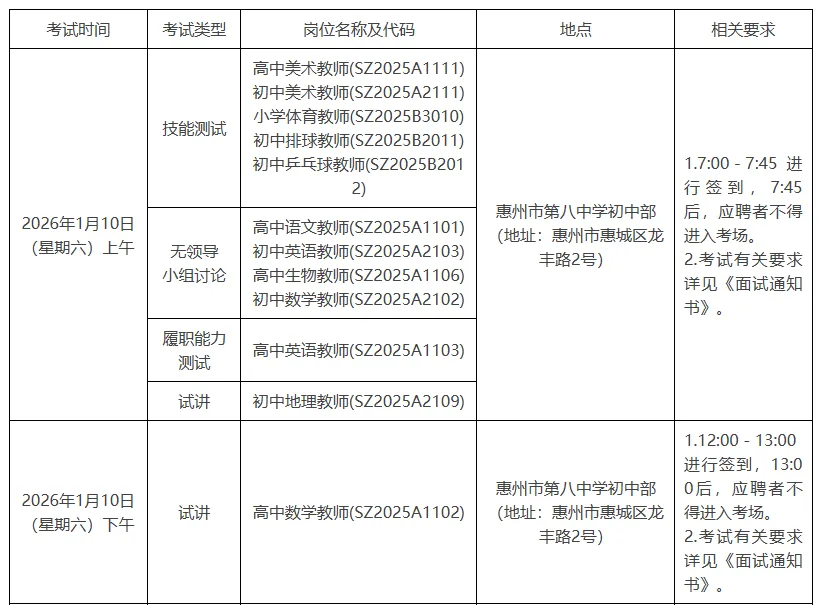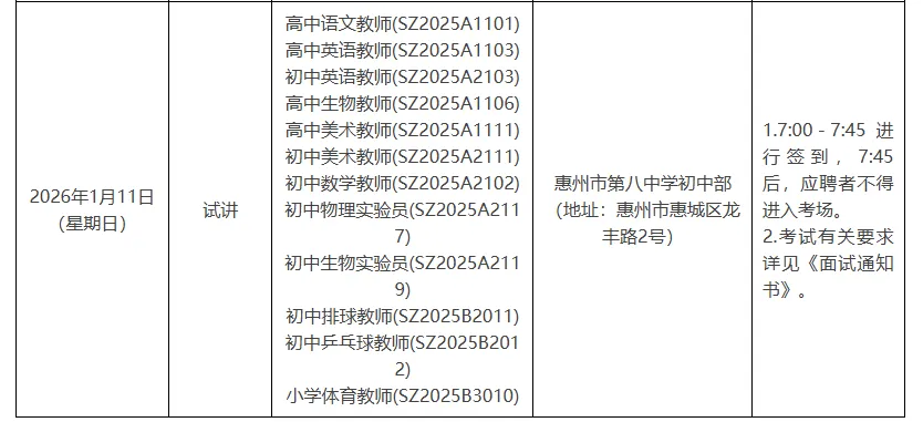重要提醒:参加“无领导小组讨论”“履职能力测试”“技能测试”的应聘者请及时关注惠州市教育局网站发布的通知公告,入围“试讲”人员名单将于考试结束当日(1月10日)进行公布。