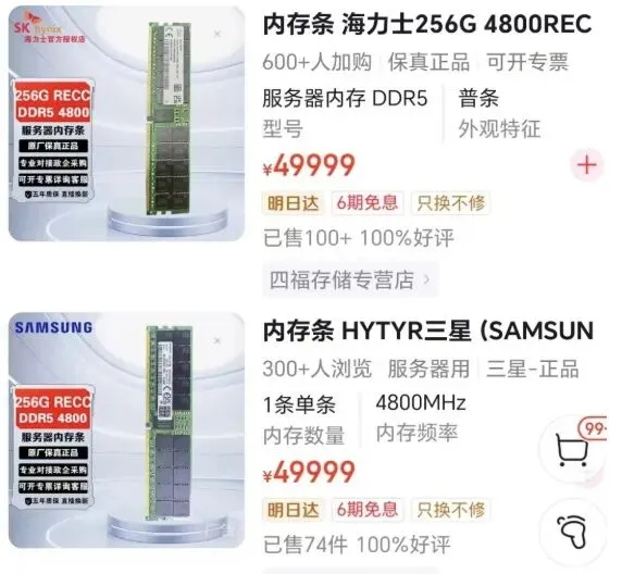 根据有关报道,目前一根海力士或三星的256gDDR5服务器内存条售价最高达49999元,一盒100根,其售价约500万元。