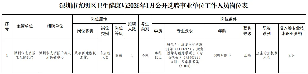 (一)岗位选聘 选聘深圳市光明区干部人才保健中心专业技术四级岗位工作人员1名,具体岗位详见《深圳市光明区卫生健康局2026年1月公开选聘事业单位工作人员岗位表》(附件1,以下简称《岗位表》)。