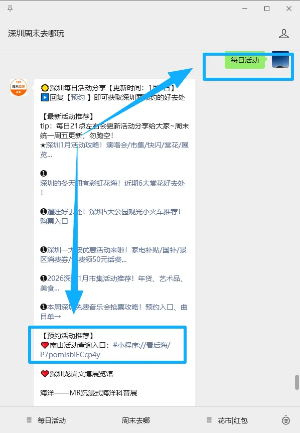 回复【每日活动】即可获取深圳最新活动推荐、本周活动推荐、以及近期赏花、免费音乐会、免费演出等活动最新消息