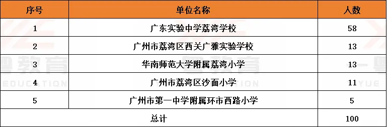 本次招聘100人涉及到5所学校招聘,分别是广东实验中学荔湾学校、广州市荔湾区西关广雅实验学校、华南师范大学附属荔湾小学、广州市荔湾区沙面小学、广州市第一中学附属环市西路小学。基本为广州名校的附属学校,其中广东实验中学荔湾学校招聘人数最多为58人,占比一半以上