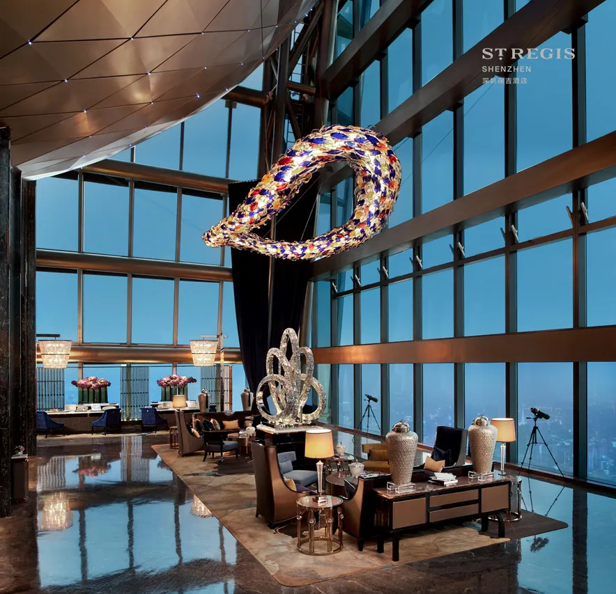 酒店空间以摩登艺术为主,有玻璃幕墙、无边泳池,大堂钻石灯饰上方的雕饰,是以片片鱼鳞的创意设计交织而成,取如雨得水,财气似水流一样源源不绝之意。