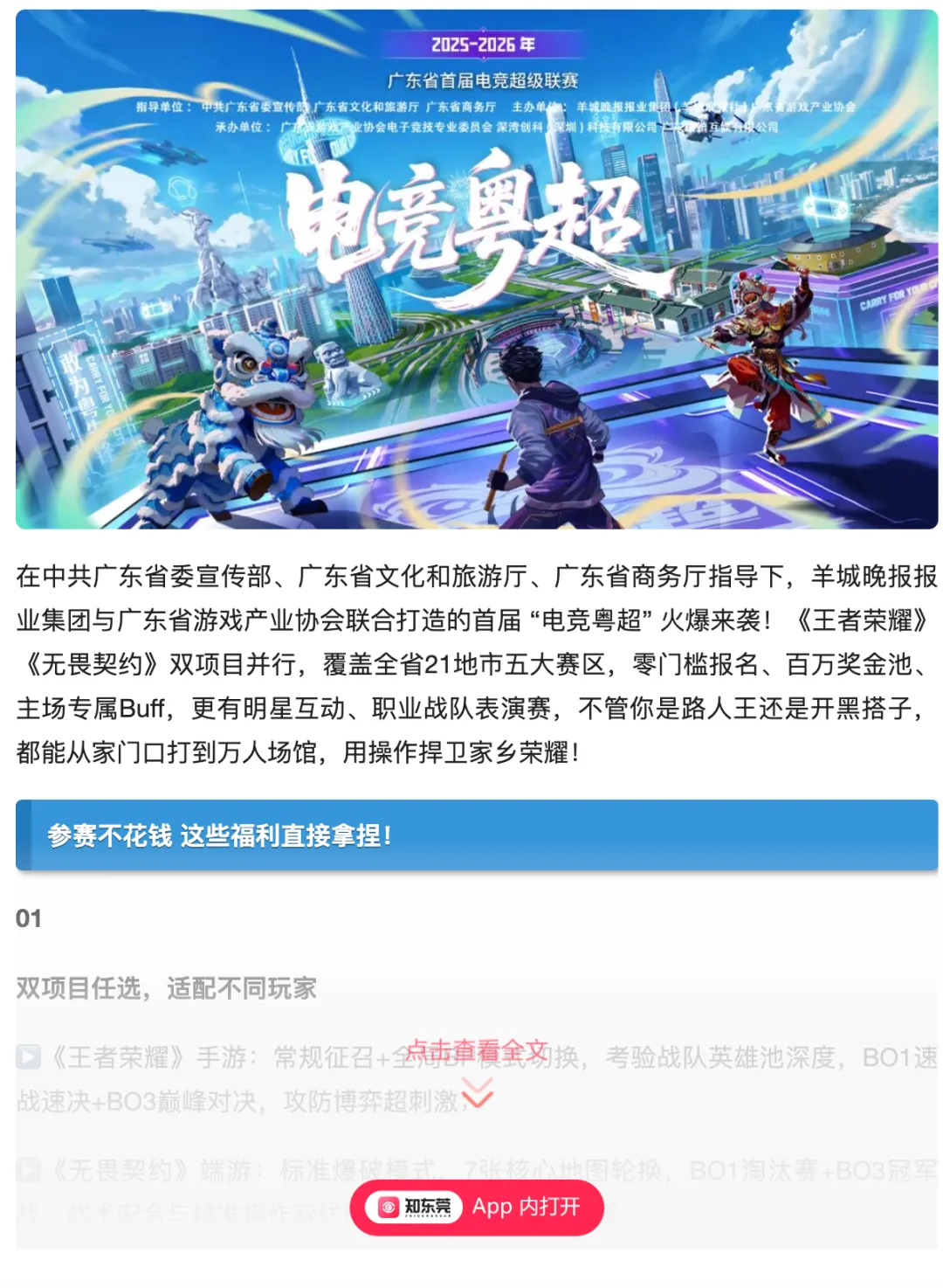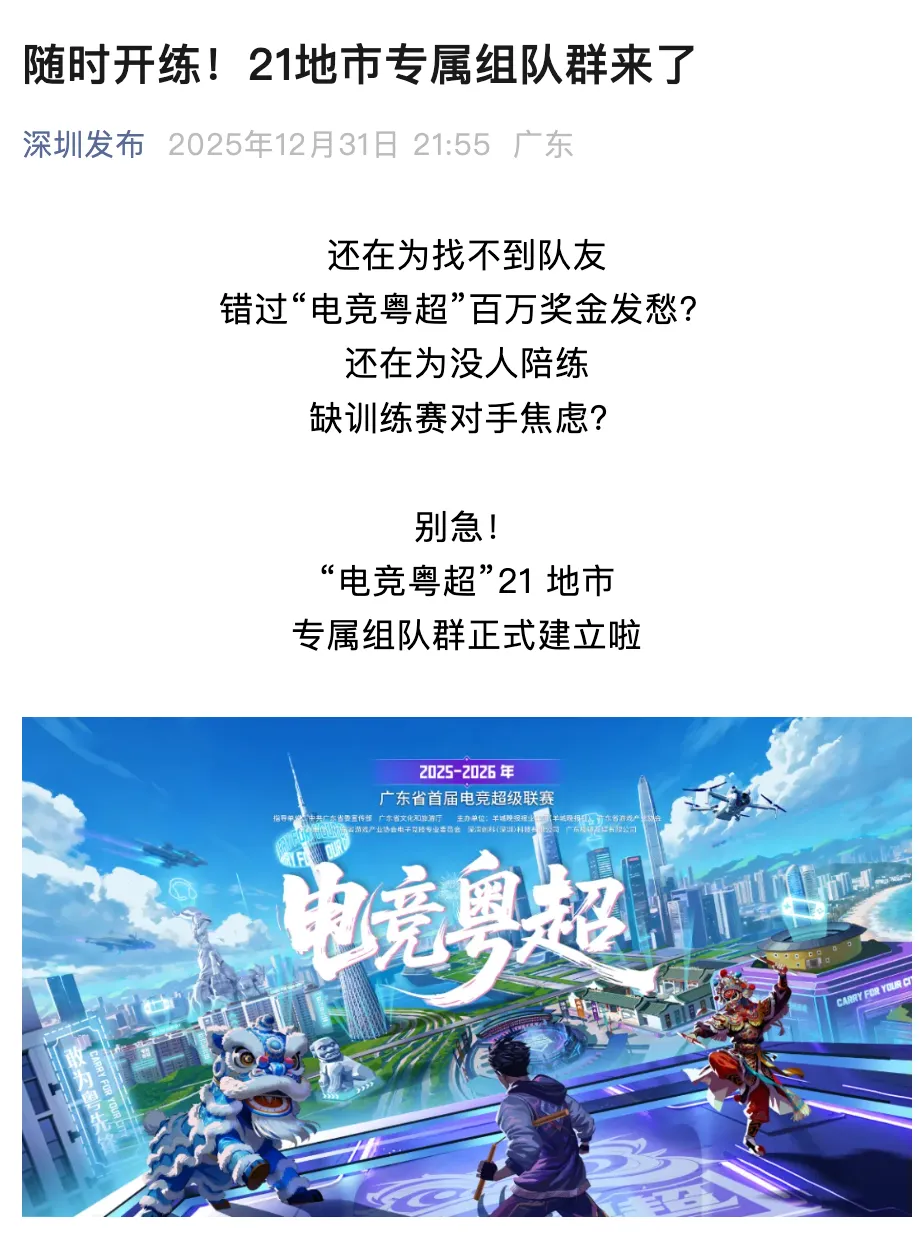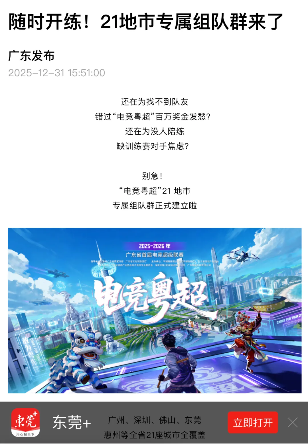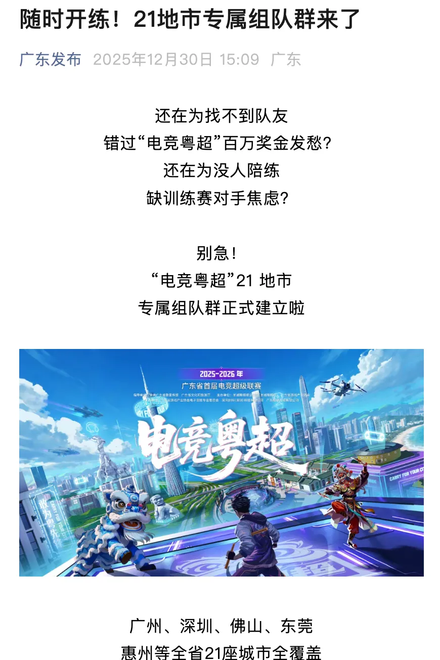 ▶️ 加入方式:关注 “电竞粤超” 官方公众号,私信发送 “城市+项目”(例:“广州+王者荣耀” “深圳+无畏契约”),即可获取城市群二维码;