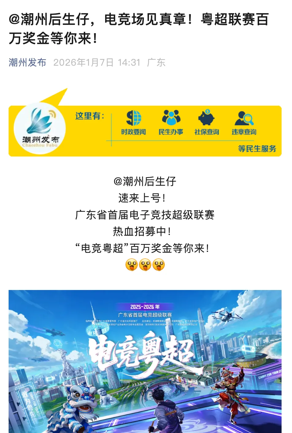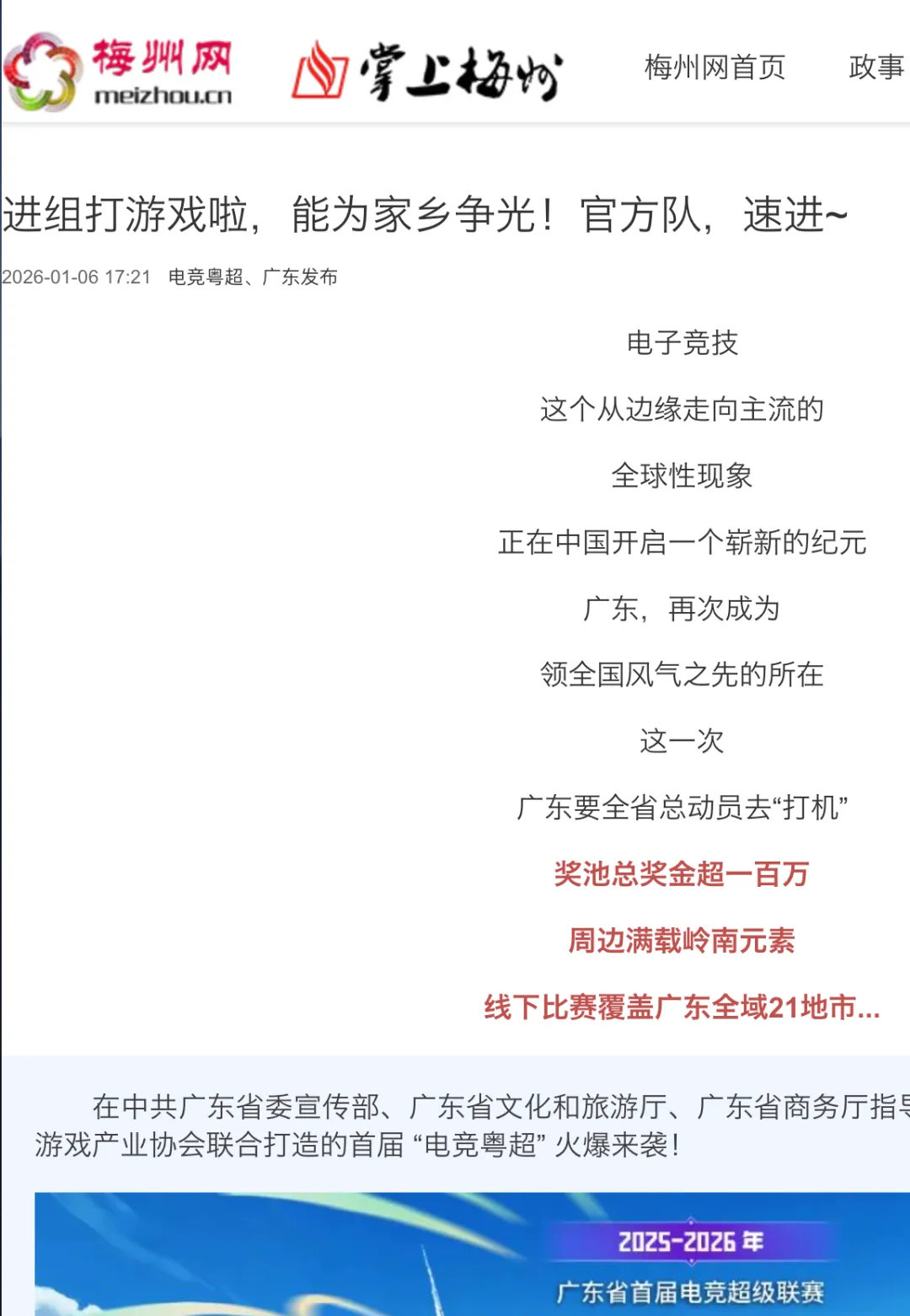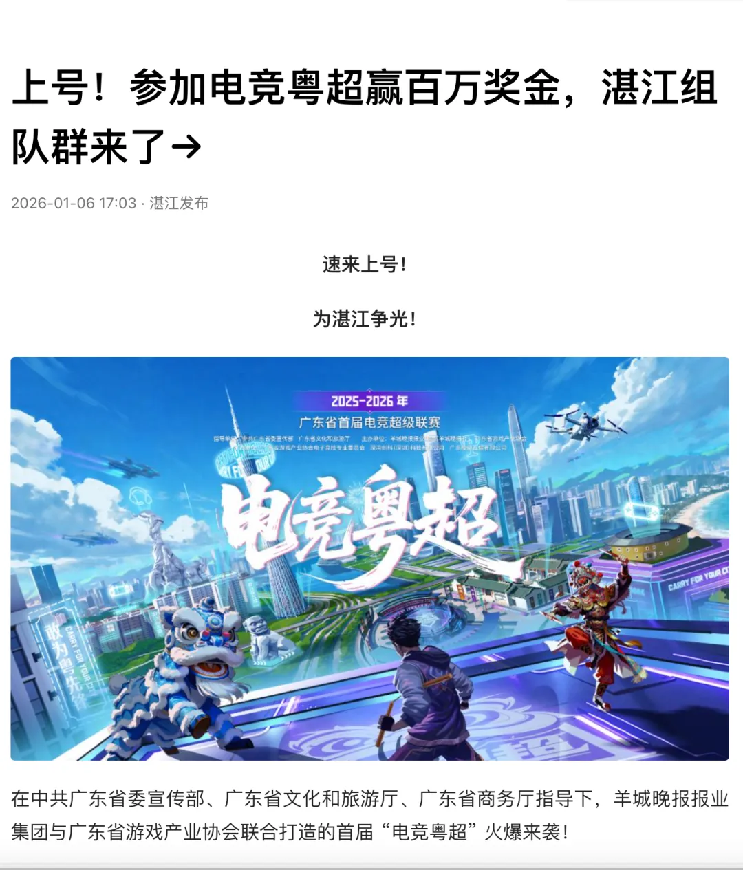当广州塔的璀璨灯光与深圳春笋大厦的霓虹同步为电竞粤超点亮,这场覆盖广东21城的全民电竞盛宴,注定自带顶级仪式感!电竞粤超自启动以来,不仅收获省级官媒的持续护航,更得到各地市官方的鼎力加持 —— 从差异化宣传到社群搭建,用实际行动点燃玩家热情,这份双向奔赴的认可,必须大声说句 “感谢”!