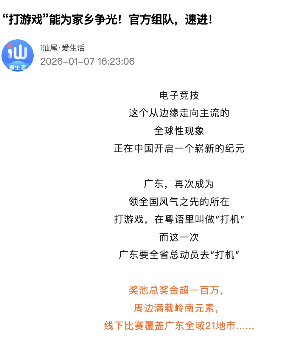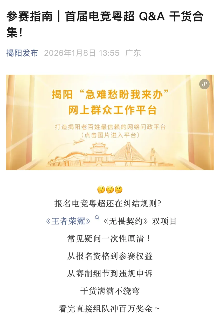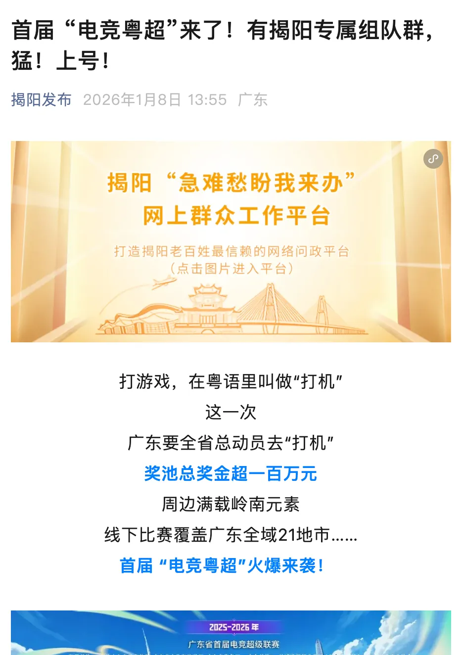 当广州塔的璀璨灯光与深圳春笋大厦的霓虹同步为电竞粤超点亮,这场覆盖广东21城的全民电竞盛宴,注定自带顶级仪式感!电竞粤超自启动以来,不仅收获省级官媒的持续护航,更得到各地市官方的鼎力加持 —— 从差异化宣传到社群搭建,用实际行动点燃玩家热情,这份双向奔赴的认可,必须大声说句 “感谢”!