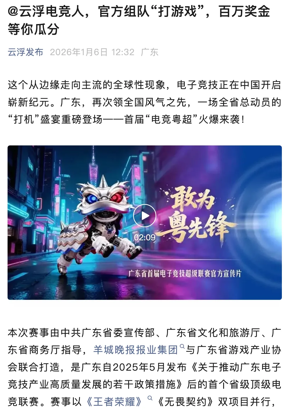 其中,羊城晚报作为核心传播载体之一,全程跟踪赛事进展与城市特色亮点;广东发布以政务背书扩大影响力,让赛事信息通过政务推荐触达千万市民;广东省游戏产业协会则发挥行业优势,为赛事专业性保驾护航。省级官媒的权威发声,搭配地标亮灯的视觉冲击,让 “电竞粤超” 迅速成为全省热议的顶流话题!