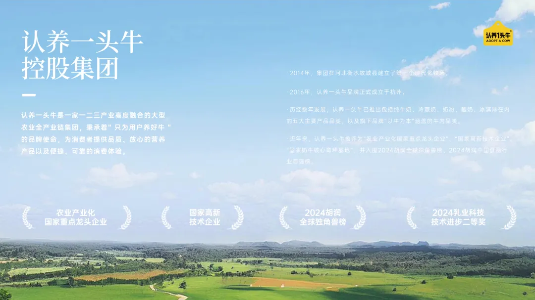 近年来,认养一头牛被评为“农业产业化国家重点龙头企业”、“国家高新技术企业”、2023年中国农业企业500强、中国农业企业奶业20强,并入围胡润研究院《2024全球独角兽榜》、“2024胡润中国食品行业百强榜”等。