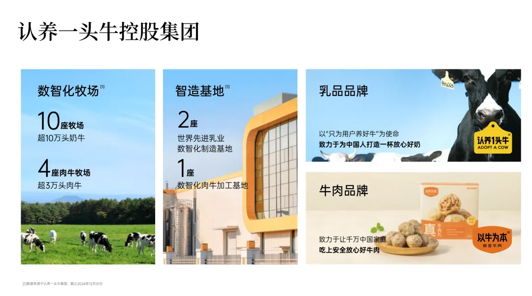 在乳业版块,认养一头牛集团已在河北、黑龙江、山东、吉林建立了10座现代化奶牛牧场,2座数智化乳制品加工厂,奶牛存栏数合计超10万头,奶源自有率超过95%,2024年,认养一头牛成母牛年平均单产13.81吨,位于全国第二。产品有纯牛奶、奶粉、酸奶、冰淇淋四大品类。
