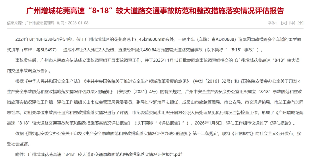 据澎湃新闻:成都哈拜网络科技有限公司平台注册的一辆顺风车此前在广州市增城区的花莞高速上追尾因事故横跨多个车道的重型厢式货车,造成小车上3人死亡2人受伤。广州市应急管理局2026年1月8日公布该事故的防范和整改措施落实情况评估报告。