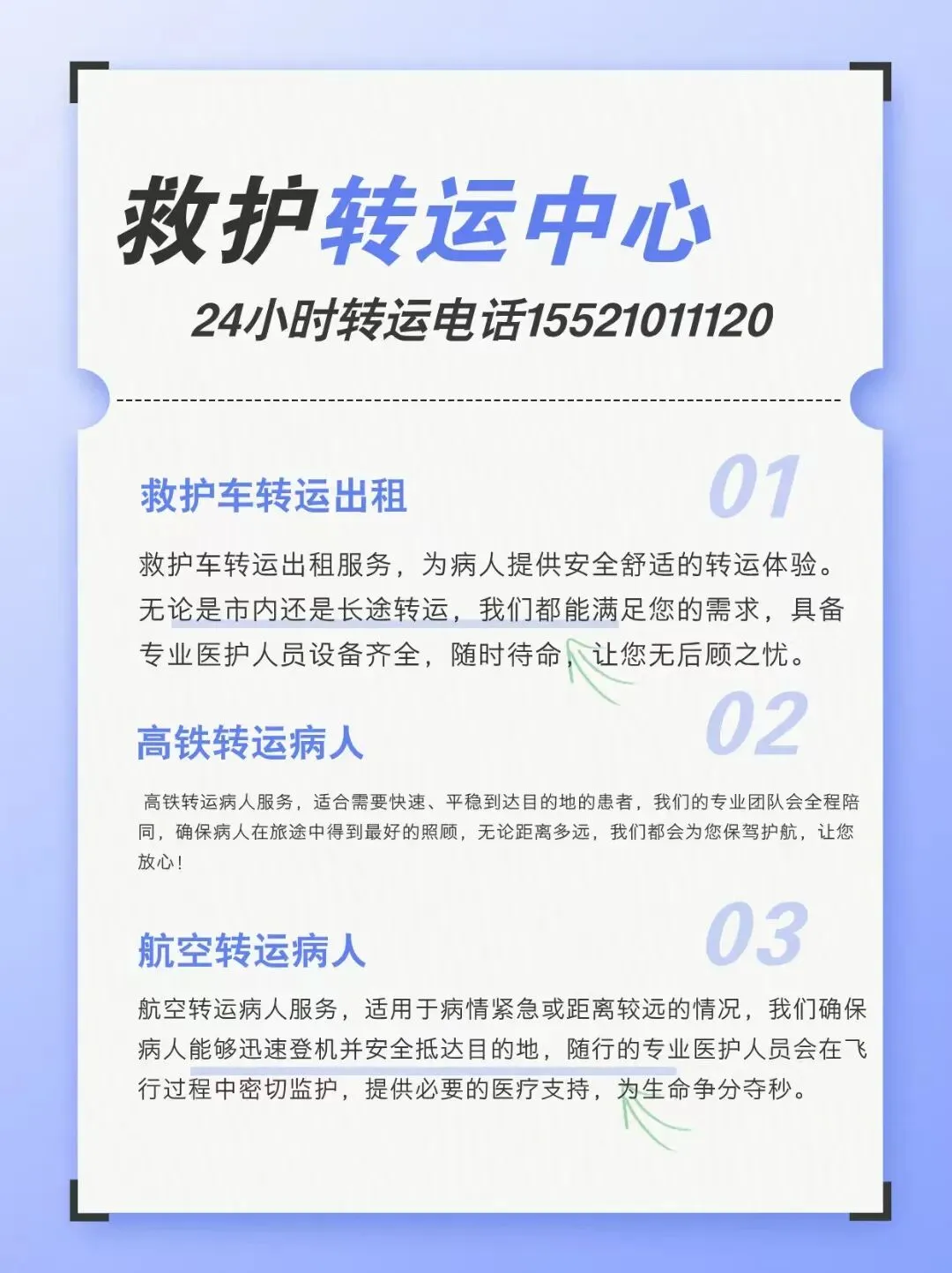东莞救护车出租转运服务流程介绍:收费标准、高铁接送、正规120护送(24小时在线)当健康需要紧急守护时,您是否遇到过这些难题?? 深夜突发疾病,普通车辆无法提供医疗支持,只能硬着头皮自驾?? 出院转院需要专业护送,却担心价格不透明、临时加价?? 异地就医后想回家,长途转运风险高,找不到靠谱的医疗级护送?别担心!24 小时待命的专业救护车出租服务已为您备好解决方案 —— 无论昼夜晨昏、短途长途,我们以极速响应、透明收费、医疗级配置,成为您身边的「移动健康守护者」。 本市救护车出租转运电话:15521011120, 24小时救护车接送电话: 15521011120 1. 24 小时在线,响应速度快人一步?? 全天候守护不打烊:客服团队 7×24 小时实时在线,深夜来电秒接,紧急订单 10 分钟内派车,杜绝「电话无人接、派车等半天」的困境;?? 双班制应急储备:储备多辆急救车与医护团队,应对雨雪天气、节假日等用车高峰,确保「车等人」而非「人等车」;?? 实时动态全掌握:提供位置共享、病情反馈服务,家属可通过微信 / 电话随时了解转运进度,全程安心无忧。 2. 专业配置拉满,护送全程有「医」靠? 正规医疗级车辆:所有车辆均获卫健委认证,标配自动上车担架、医用转运床、恒温消毒系统,拒绝普通车辆改装,从源头保障安全;? 持证医护随行:短途配备经验丰富的护士(可协助服药、基础护理),长途 / 重症患者加派医生跟车,实时监测生命体征(心率、血氧、血压),支持吸氧、输液等持续治疗;? 全场景设备支持:基础急救箱(止血包、急救药品)、多参数心电监护仪、呼吸机、除颤仪等按需配备,打造「移动监护病房」,让转运成为治疗的安全延续。 3. 收费透明如镜,拒绝任何隐形消费我们深知费用清晰是信任的基础,推行 「三公开一承诺」体系:?? 项目公开:基础费(车辆 + 司机 + 基础设备)、里程 / 时长费、重症设备使用费(如呼吸机)分项列明,无捆绑消费;?? 标准公开:短途按里程计费(50 公里内 / 外不同标准),长途按「距离 + 时长」综合核算,夜间 / 节假日不加价;?? 明细公开:出发前提供加盖公章的《费用确认单》,高速费、停车费实报实销,全程可追溯;? 承诺无套路:绝不以「加急费」「调度费」等名义临时加价,让每一分钱都花在刀刃上 全场景覆盖,您需要的转运场景我们都能接服务类型 适用场景 核心保障?短途急救接送 出院回家、复诊透析、突发不适送医 30 分钟内响应,护士随行 + 基础医疗支持?长途跨市转运 跨省转院、异地返乡、康复期长途护送 医生 + 护士双陪护,重症设备全程运行?特殊人群护送 老年患者、术后康复者、行动不便人群 适老化设施(防滑垫、保暖毯)+ 精细照护?活动医疗保障 赛事、展会等大型活动应急医疗支持 现场值守 + 快速转运,筑牢安全防线??? 收费标准清晰明了(仅供参考,以实际方案为准)短途服务(50 公里内):基础费 + 里程费,含护士 1 名及基础设备,适合出院、复诊等日常转运;长途服务(50 公里以上):基础费 + 里程费 + 医护服务费,按需配备医生,支持 24 小时持续监护;重症转运:在长途基础上增加重症设备使用费(如呼吸机、微量泵),费用提前沟通无追加;注:所有订单均提供免费病情评估与路线规划,无任何咨询费用。?? 24 小时热线:400-996-2227 ??? 立即开启安心转运? 1 分钟响应:电话 / 微信 / 线上表单多渠道接单,快速匹配最优方案;? 免费定制:根据病情、距离、设备需求,量身定制专属转运计划;? 全程无忧:从出发医院到目的地,交接诊疗记录、协助搬运患者,服务直至「最后一米」。选择我们的三大理由:? 响应快:24 小时待命,紧急时刻分秒必争,为生命争取黄金时间;? 够专业:正规车辆 + 持证团队 + 标准化流程,转运全程符合医疗级标准;? 无套路:价格透明如镜,拒绝任何隐形消费,让安心从沟通开始。健康经不起等待,守护容不得马虎。无论何时何地,只要您需要,我们的救护车永远为您亮着「待命灯」—— 这是对生命的敬畏,更是对每个家庭的郑重承诺。立即拨打:15521011120(拨打24小时热线电话、获取更多转运知识与优惠信息)