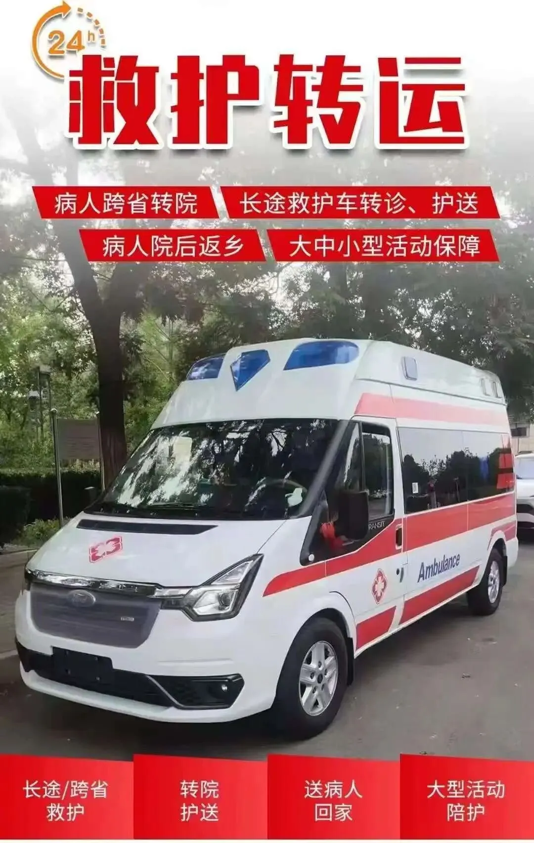 我们是救护车出租转运公司,120救护车接送病人预约护送。24小时为术后康复、危重患者及跨区域就医人群提供专业医疗转运服务,提供120救护车转运出租‖私人120救护车(非急救)‖跨省长途转运‖危重病人转运‖市内转运‖术后康复病人转运‖高铁病人转运‖患者返乡‖大型活动赛事保障‖配备ICU设备:呼吸机▪心电监护仪▪吸痰器•微量泵•氧气▪急救药箱▪专业医护团队