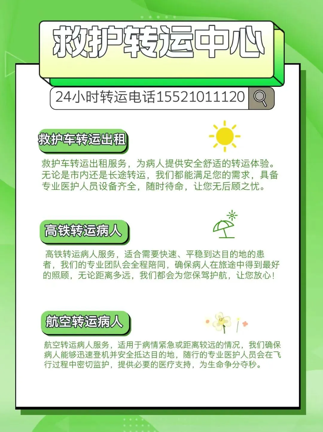 广州救护车出租转运服务流程介绍:收费标准、高铁接送、长途护送(正规120非急救)当健康需要紧急守护时,您是否遇到过这些难题?? 深夜突发疾病,普通车辆无法提供医疗支持,只能硬着头皮自驾?? 出院转院需要专业护送,却担心价格不透明、临时加价?? 异地就医后想回家,长途转运风险高,找不到靠谱的医疗级护送?别担心!24 小时待命的专业救护车出租服务已为您备好解决方案 —— 无论昼夜晨昏、短途长途,我们以极速响应、透明收费、医疗级配置,成为您身边的「移动健康守护者」。 本市救护车出租转运电话:15521011120, 24小时救护车接送电话: 15521011120 1. 24 小时在线,响应速度快人一步?? 全天候守护不打烊:客服团队 7×24 小时实时在线,深夜来电秒接,紧急订单 10 分钟内派车,杜绝「电话无人接、派车等半天」的困境;?? 双班制应急储备:储备多辆急救车与医护团队,应对雨雪天气、节假日等用车高峰,确保「车等人」而非「人等车」;?? 实时动态全掌握:提供位置共享、病情反馈服务,家属可通过微信 / 电话随时了解转运进度,全程安心无忧。 2. 专业配置拉满,护送全程有「医」靠? 正规医疗级车辆:所有车辆均获卫健委认证,标配自动上车担架、医用转运床、恒温消毒系统,拒绝普通车辆改装,从源头保障安全;? 持证医护随行:短途配备经验丰富的护士(可协助服药、基础护理),长途 / 重症患者加派医生跟车,实时监测生命体征(心率、血氧、血压),支持吸氧、输液等持续治疗;? 全场景设备支持:基础急救箱(止血包、急救药品)、多参数心电监护仪、呼吸机、除颤仪等按需配备,打造「移动监护病房」,让转运成为治疗的安全延续。 3. 收费透明如镜,拒绝任何隐形消费我们深知费用清晰是信任的基础,推行 「三公开一承诺」体系:?? 项目公开:基础费(车辆 + 司机 + 基础设备)、里程 / 时长费、重症设备使用费(如呼吸机)分项列明,无捆绑消费;?? 标准公开:短途按里程计费(50 公里内 / 外不同标准),长途按「距离 + 时长」综合核算,夜间 / 节假日不加价;?? 明细公开:出发前提供加盖公章的《费用确认单》,高速费、停车费实报实销,全程可追溯;? 承诺无套路:绝不以「加急费」「调度费」等名义临时加价,让每一分钱都花在刀刃上 全场景覆盖,您需要的转运场景我们都能接服务类型 适用场景 核心保障?短途急救接送 出院回家、复诊透析、突发不适送医 30 分钟内响应,护士随行 + 基础医疗支持?长途跨市转运 跨省转院、异地返乡、康复期长途护送 医生 + 护士双陪护,重症设备全程运行?特殊人群护送 老年患者、术后康复者、行动不便人群 适老化设施(防滑垫、保暖毯)+ 精细照护?活动医疗保障 赛事、展会等大型活动应急医疗支持 现场值守 + 快速转运,筑牢安全防线??? 收费标准清晰明了(仅供参考,以实际方案为准)短途服务(50 公里内):基础费 + 里程费,含护士 1 名及基础设备,适合出院、复诊等日常转运;长途服务(50 公里以上):基础费 + 里程费 + 医护服务费,按需配备医生,支持 24 小时持续监护;重症转运:在长途基础上增加重症设备使用费(如呼吸机、微量泵),费用提前沟通无追加;注:所有订单均提供免费病情评估与路线规划,无任何咨询费用。?? 24 小时热线:400-996-2227 ??? 立即开启安心转运? 1 分钟响应:电话 / 微信 / 线上表单多渠道接单,快速匹配最优方案;? 免费定制:根据病情、距离、设备需求,量身定制专属转运计划;? 全程无忧:从出发医院到目的地,交接诊疗记录、协助搬运患者,服务直至「最后一米」。选择我们的三大理由:? 响应快:24 小时待命,紧急时刻分秒必争,为生命争取黄金时间;? 够专业:正规车辆 + 持证团队 + 标准化流程,转运全程符合医疗级标准;? 无套路:价格透明如镜,拒绝任何隐形消费,让安心从沟通开始。健康经不起等待,守护容不得马虎。无论何时何地,只要您需要,我们的救护车永远为您亮着「待命灯」—— 这是对生命的敬畏,更是对每个家庭的郑重承诺。立即拨打:15521011120(拨打24小时热线电话、获取更多转运知识与优惠信息)