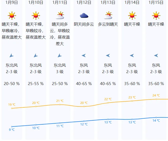 ➤预计1月10日—11日晴天干燥持续,气温逐日缓慢回升,早晚仍较寒冷;➤1月12日湿度加大,云量增多;➤1月13日—15日转晴天干燥,早晚清凉,白天温暖。