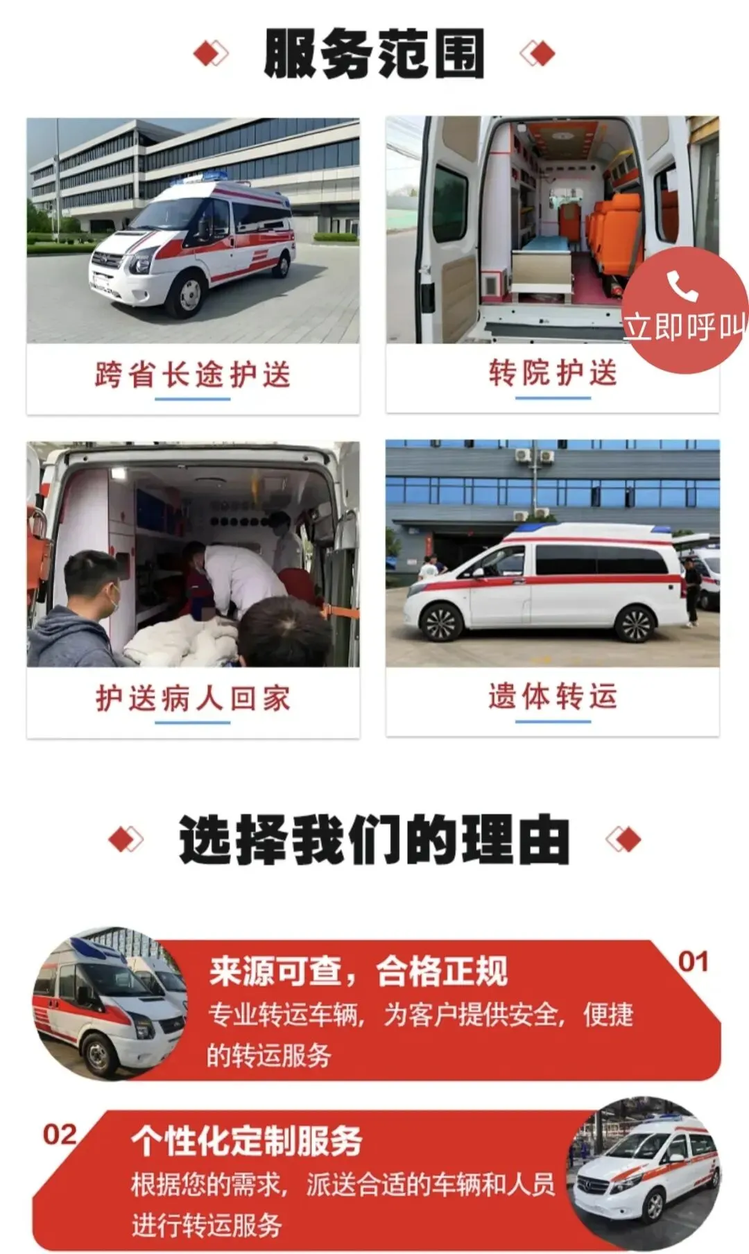 不管是白天出院、深夜转院,还是节假日需要接送,随时call都能安排,跨市转运也能精准调度!