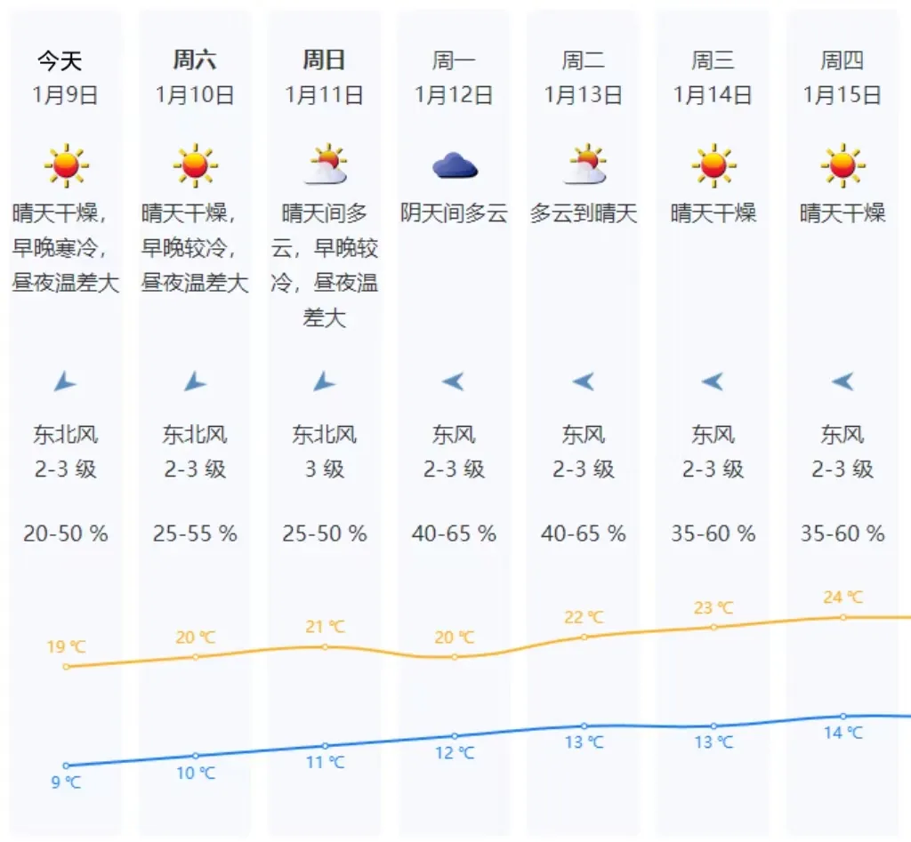 【具体天气预报】9日持续晴天干燥,昼夜温差大,早晚寒冷,气温9-19℃;10-11日晴天干燥持续,气温逐日缓慢回升,早晚仍较寒冷;12日湿度加大,云量增多;13-15日转晴天干燥,早晚清凉,白天温暖。