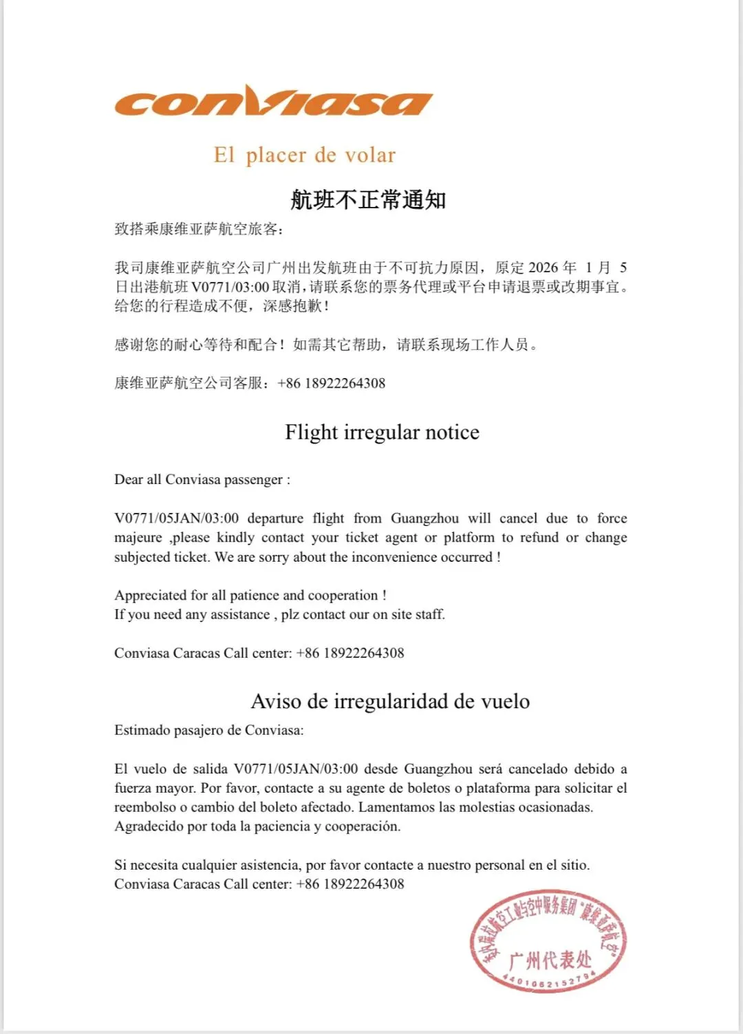 北京时间3日下午,委内瑞拉康维亚萨航空公司(委内瑞拉国家航空公司)发布通知称,由于不可抗力因素,原定于2026年1月5日3时起飞的V0771航班(由广州飞往加拉加斯)已被取消。
