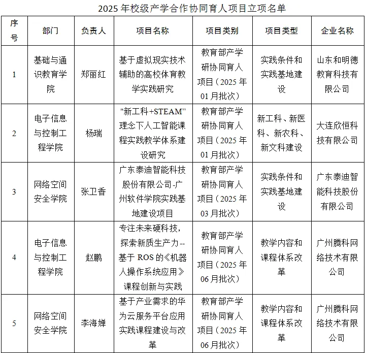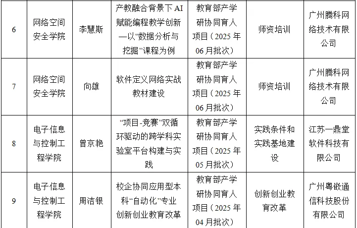 2025年度,经教师个人申请、所在学院同意、企业遴选、校企签订项目合作协议、学校审核及平台备案,我校申报建设并获批的产学合作协同育人项目共计9项。