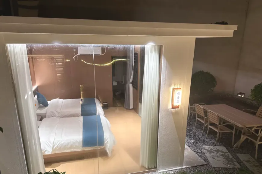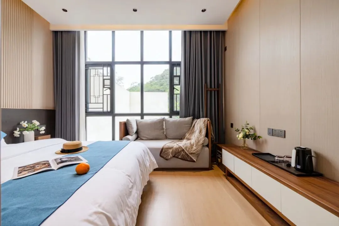 整栋院落共设10间房、18张床,每间房均以原木色系搭配清新ins风元素,床品亲肤柔软,全景落地窗将山野绿意引入室内,躺在床上就能欣赏日出与晚霞。