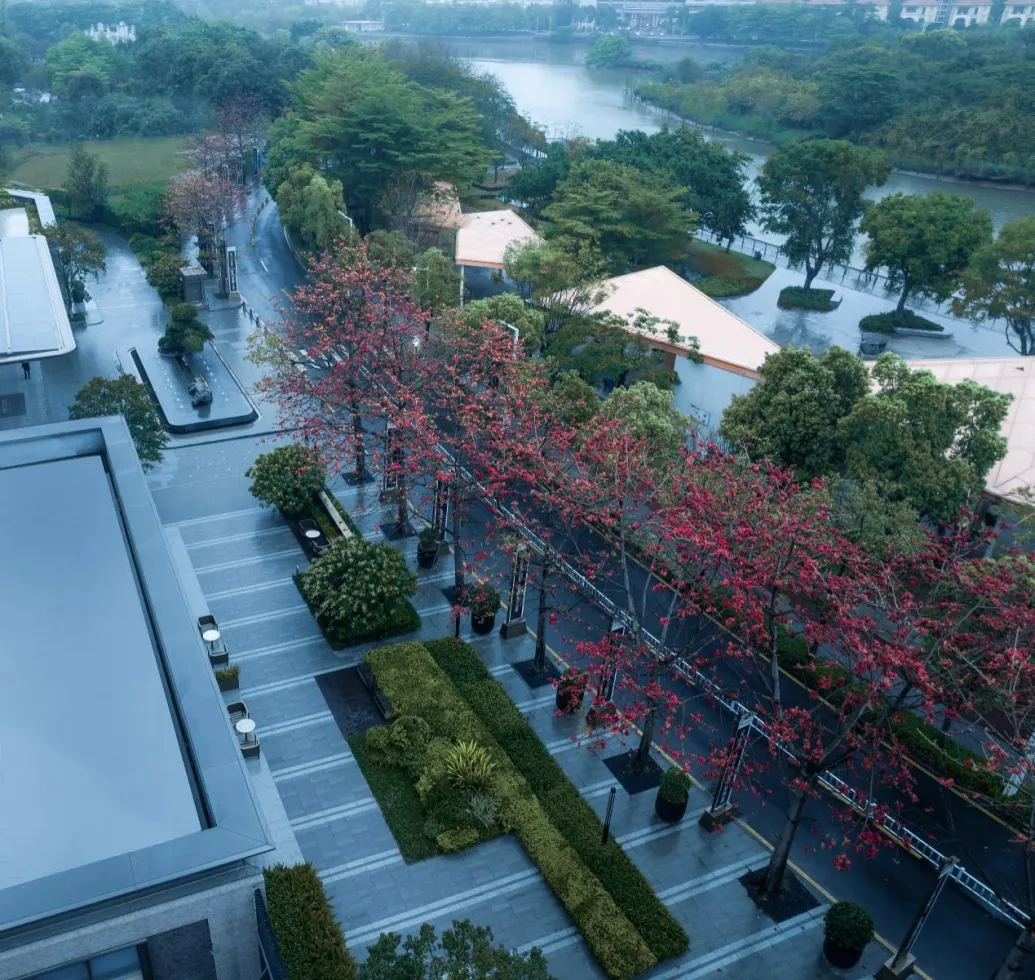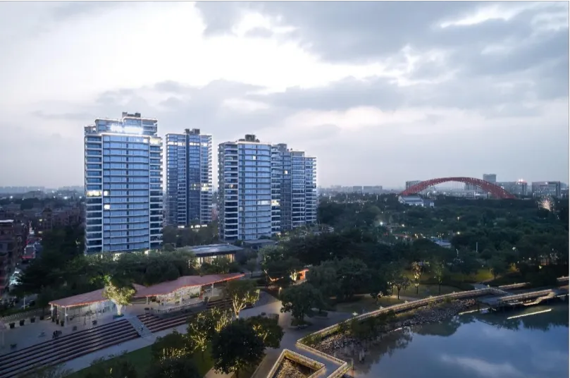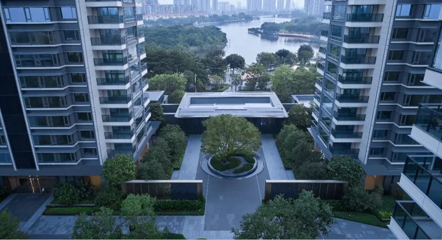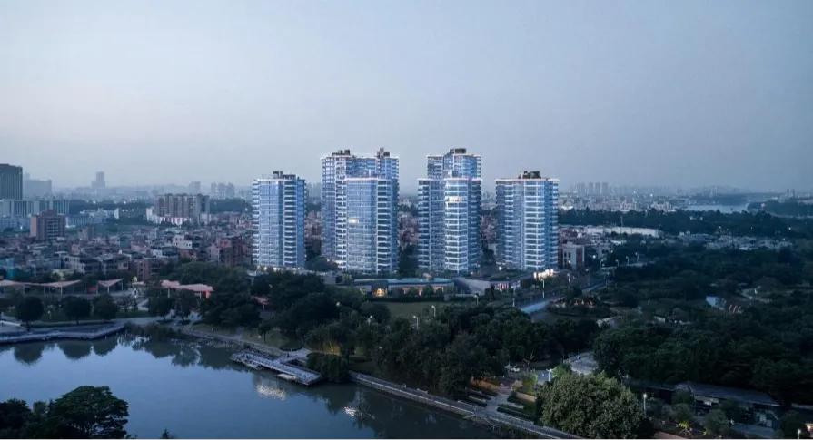 项目的首要命题是如何回应并升华这片天赋之地。最好的建筑不是与自然对抗,而是与之对话。便摒弃了常规的排列逻辑,采用了“定制规划”的核心理念,每一栋建筑的朝向与角度,都是经过精密计算与环境评估后的“定制化”成果,使其与东江、岛屿和绿带形成最佳的视觉通廊,实现270°的环幕式观景体验。项目采用中心大花园围合式布局,其开阔的尺度相当于龙湾岛面积的1/4.5。这种布局不仅营造出强烈的领域感和社区归属感,更将巨大的绿色空间还给了居民。整个场地犹如被东江环抱,同时又为一片全景绿幕视野所环绕,将4.8公里的绵长江岸线、白鹭栖息的动态生态场景,无缝融入日常的生活画卷之中。